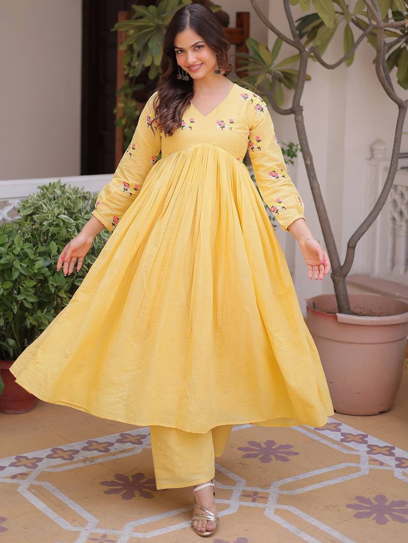 The Soft Yellow Tone With Subtle Floral Accents Makes This Outfit Perfect For Casual Outings, Daytime Events, Festive Gatherings, And Summer Wear.