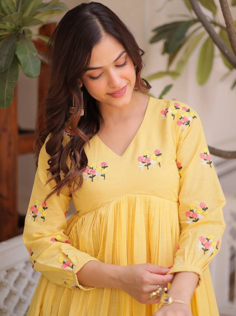 Fresh And Elegant, The Kurti Comes In A Soft Pastel Yellow Cotton Color With Delicate Pink, Peach, And Light Green Floral Embroidery, Adding A Graceful Touch To The Bright Base.