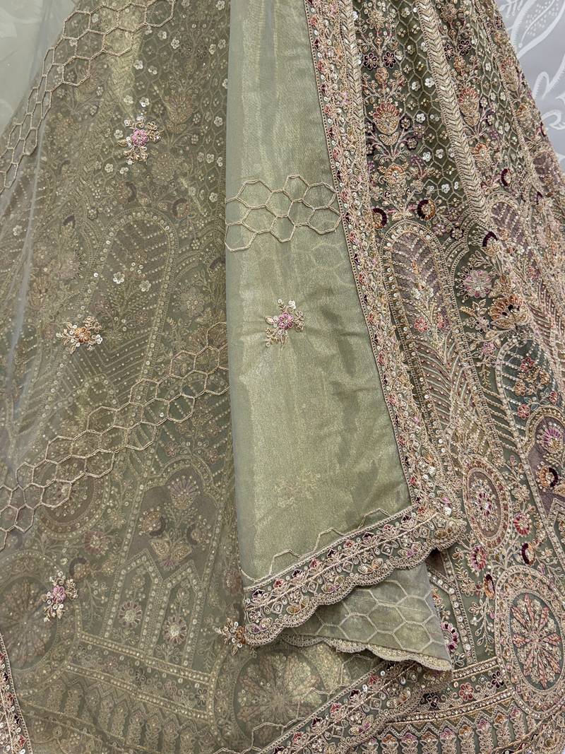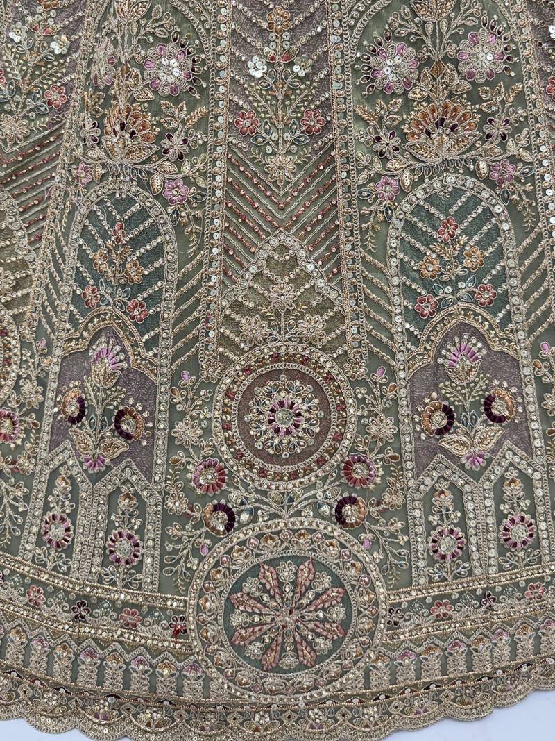 | Product Description | The Lehenga Features A Soothing Sage Green Base With Soft Olive Undertones, Beautifully Enhanced With Antique Gold Embroidery And Delicate Hints Of Blush Pink, Wine, And Muted Pastel Accents, Creating A Fresh Yet Regal Look.
