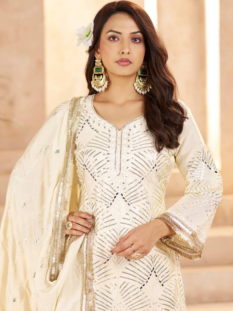 This Elegant Off White Suit Set Is Crafted From Premium Chinon Fabric For The Kurti, Palazzo, And Dupatta, Giving It A Soft, Flowy Drape And A Luxurious Feel.