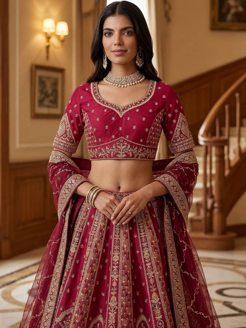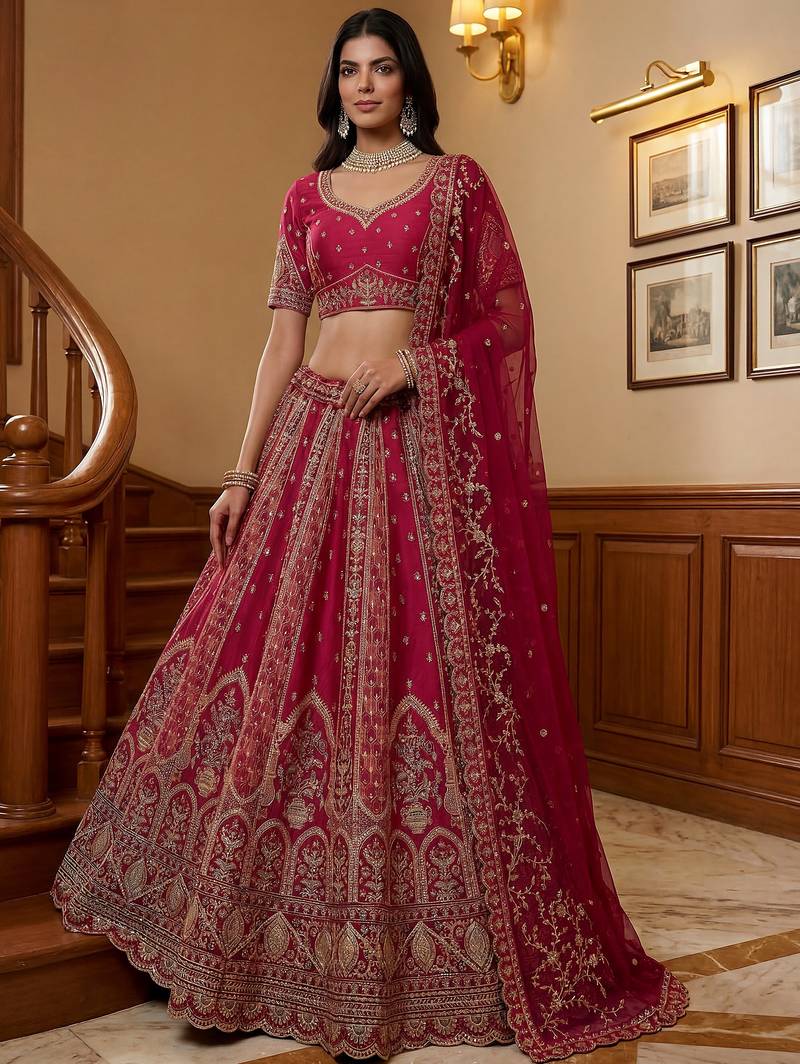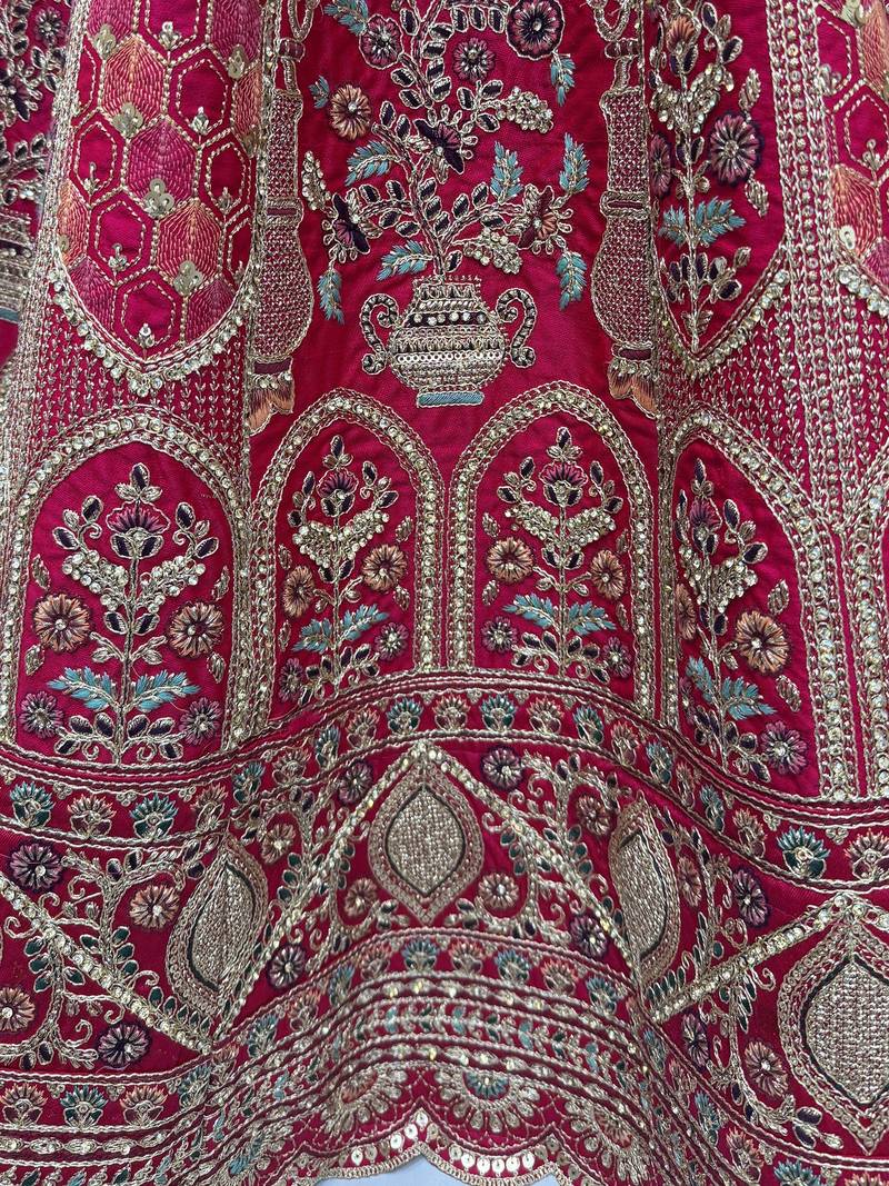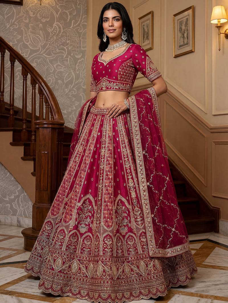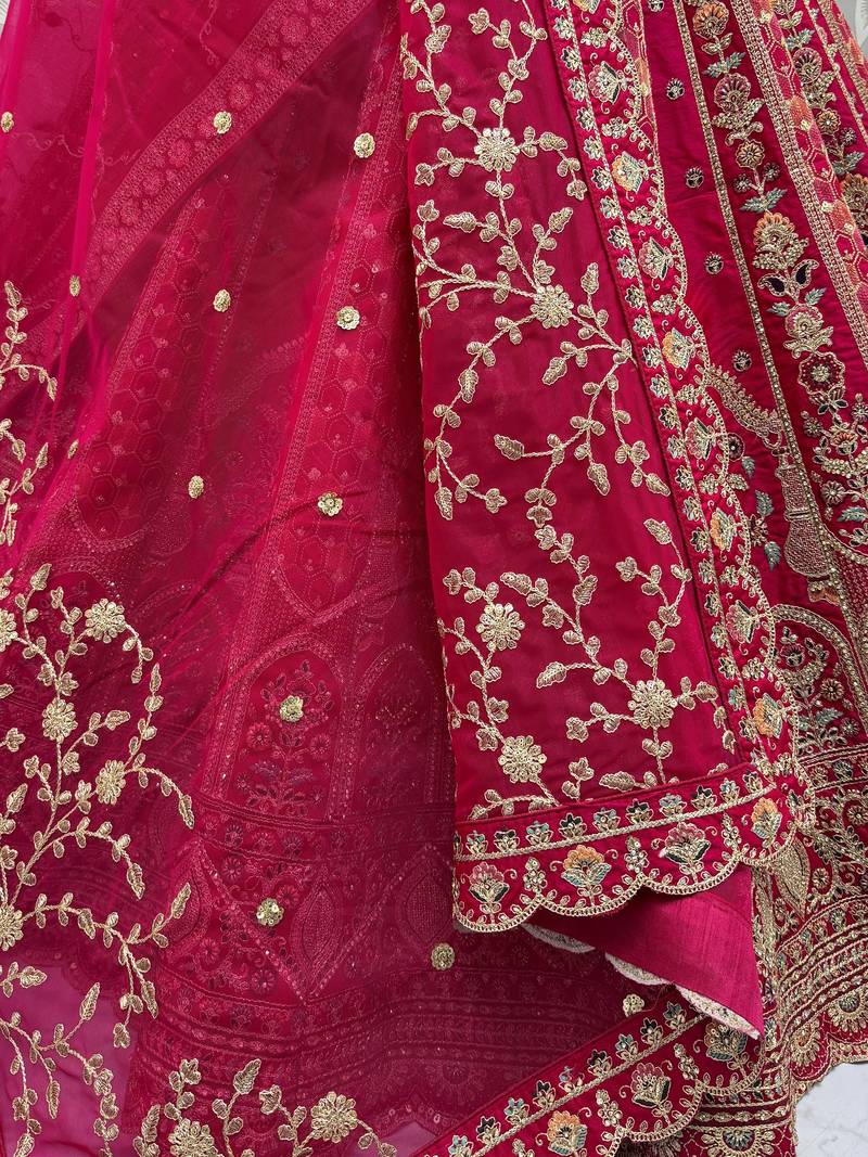 | Product Description | The Lehenga Is Presented In A Rich And Vibrant Rani Pink/Dark Pink Silk Fabric, Giving A Bright And Festive Appeal. It Is Beautifully Adorned With Gold Zari, Thread Embroidery, Sequins, And Fancy Lace Work, Creating A Striking Contrast And Luxurious Finish.