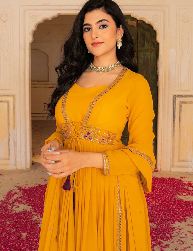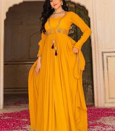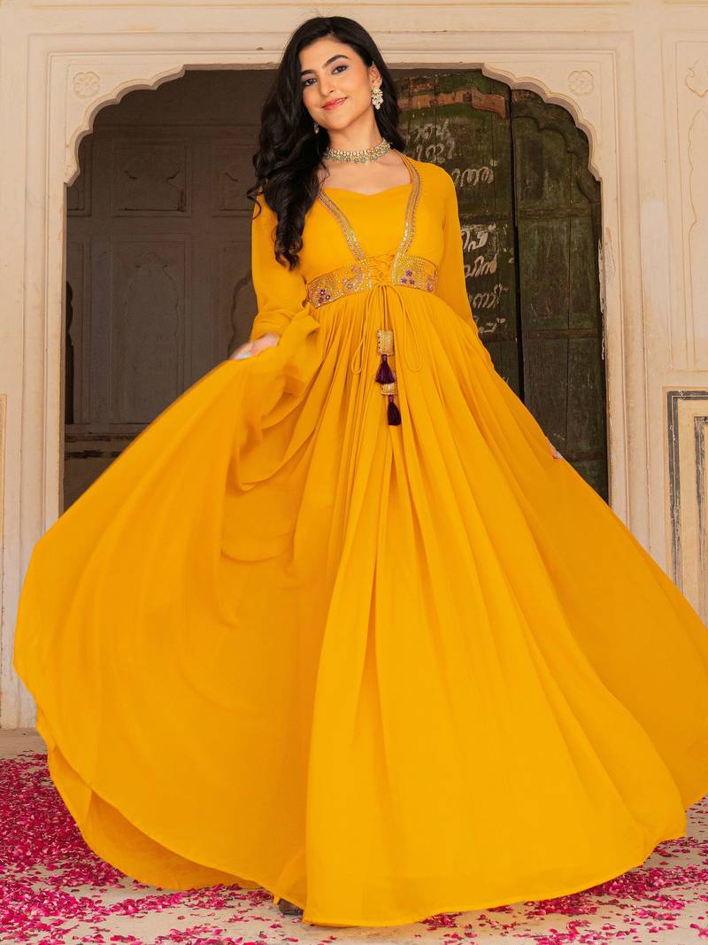 Stunning yellow embroidered georgette haldi wear gown with dupatta stitched