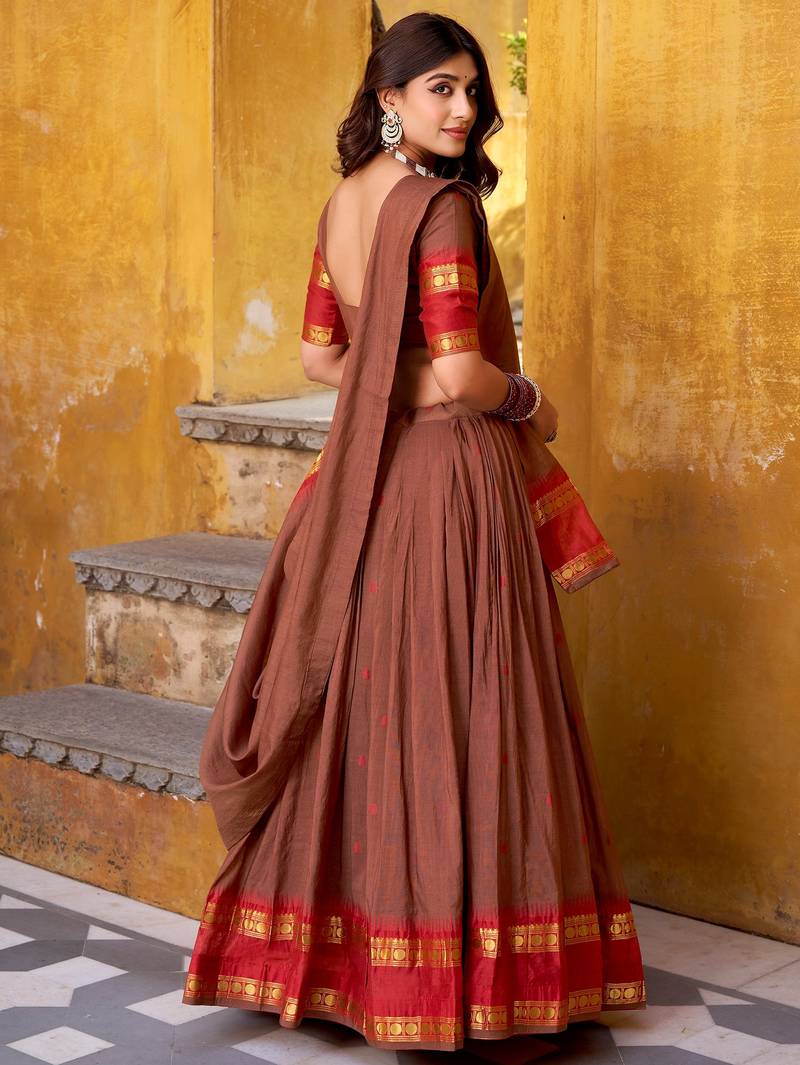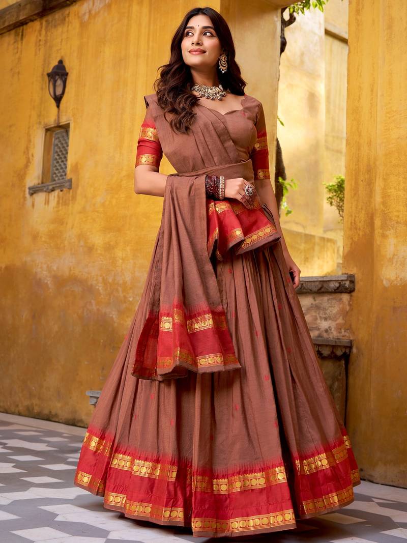 The Lehenga Is Styled In A Warm Coffee Brown Shade, Beautifully Accented With A Rich Red Border And Gold Zari Weaving, Creating A Bold And Traditional Contrast. With A 4 Meter Flair And 41 Inch Length, It Supports Waist Sizes Up To 42 Inches, Giving A Graceful And Elegant Flow.