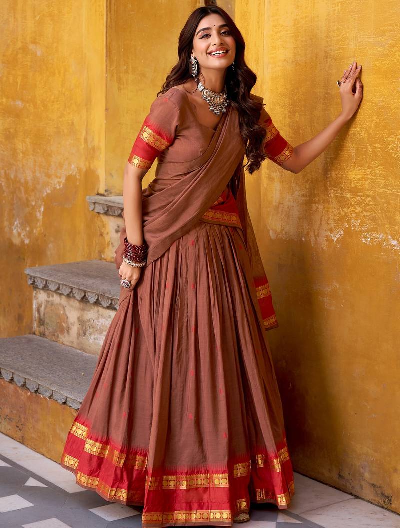 Super Brown Zari Work Chanderi Marriage Wear Half Saree Lehenga