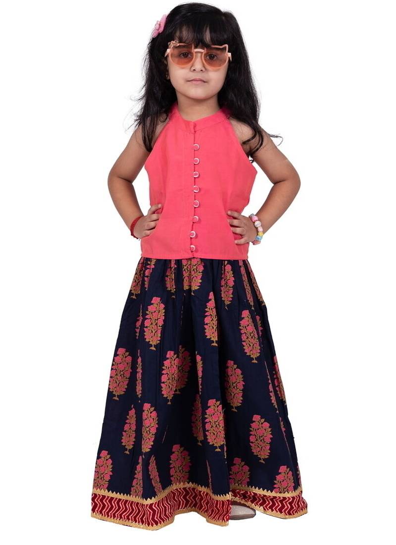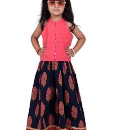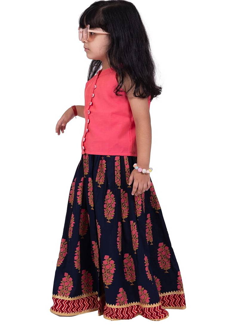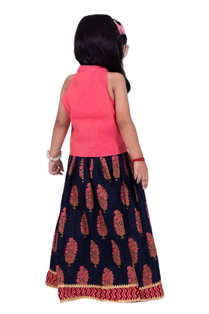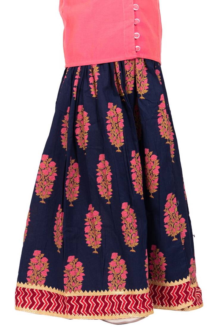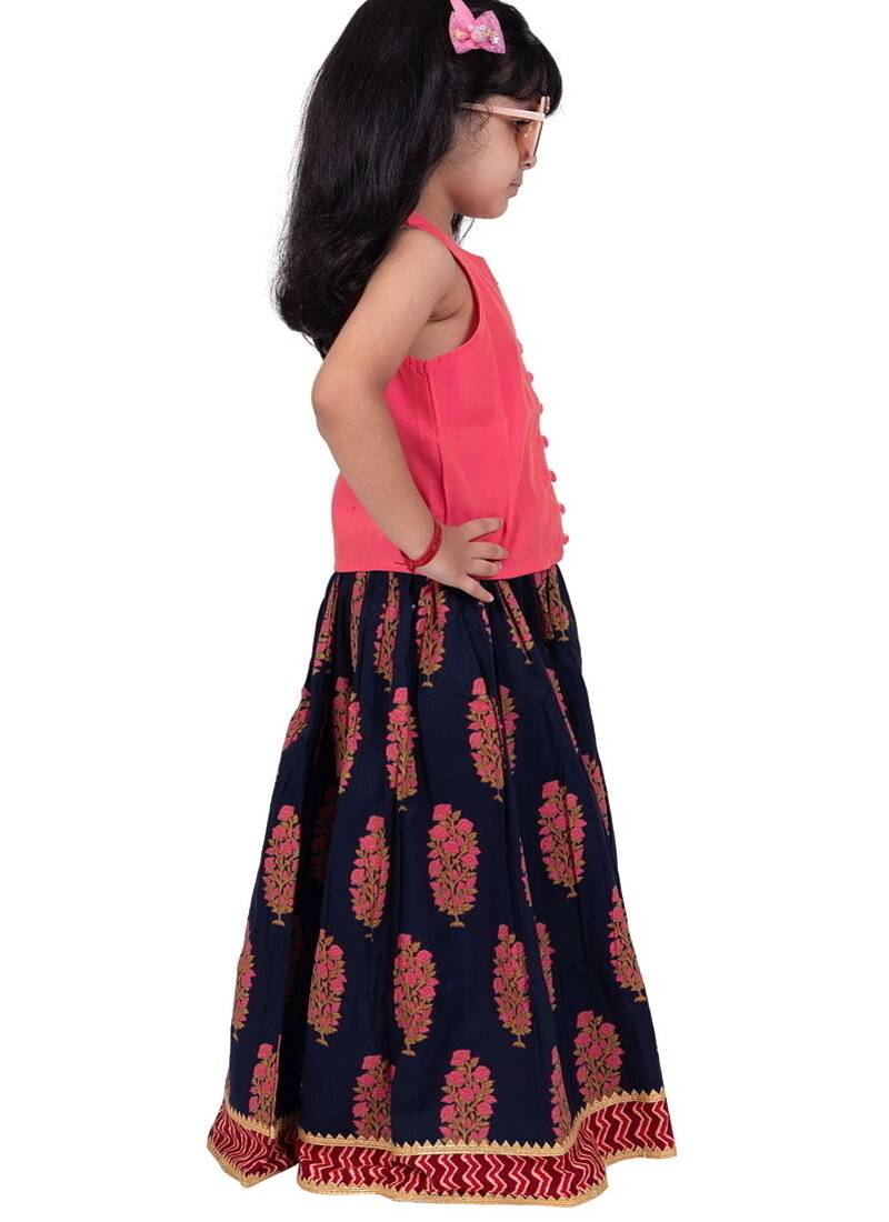 Product Name Chanderi Woven Sleeveless Solid Top & Kalamkari Print Lehenga Coral &Blue