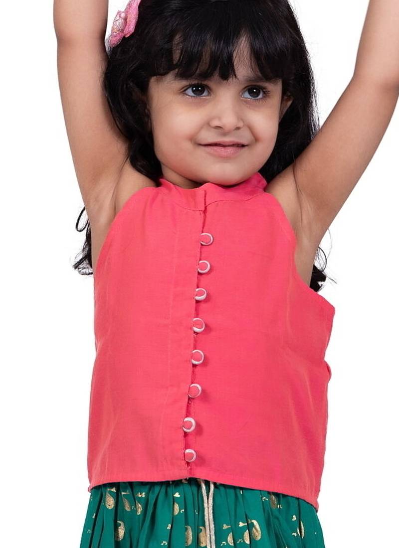 Chanderi woven sleeveless solid top & printed lehenga-coral & green