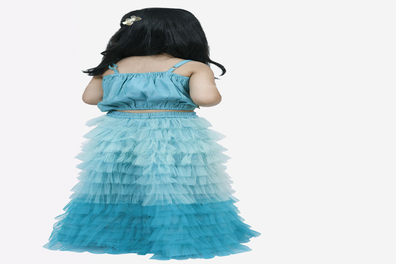 Elaisha woven sleeveless placement embroidered top with net lehenga-blue