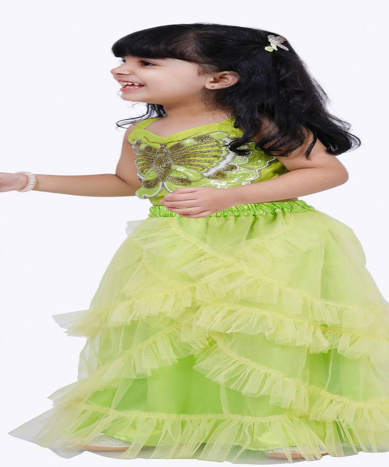 | Product Description | Elaisha Woven Sleeveless Placement Embroidered Top With Net Lehenga Limegreen |