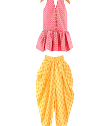 | Product Name | Woven Cotton Sleeveless Printed Top With Printed Dhoti Coral & Yellow | |