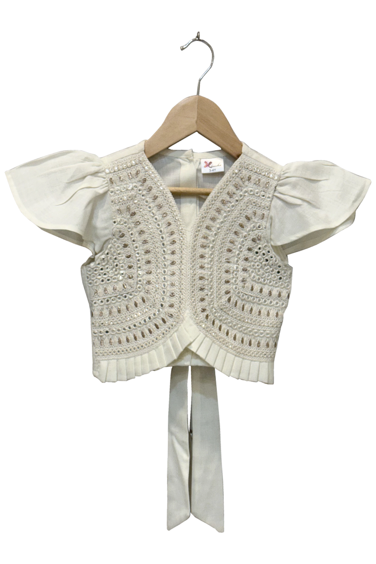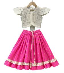 Woven half sleeves embellished top with printed lehenga-white & pink