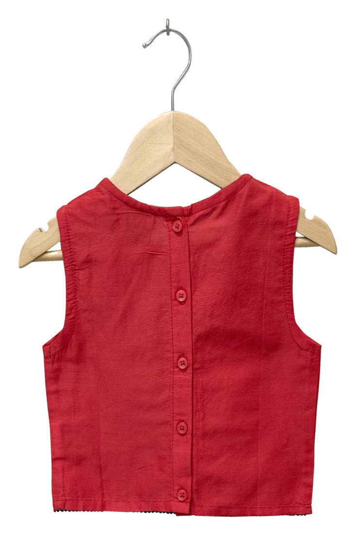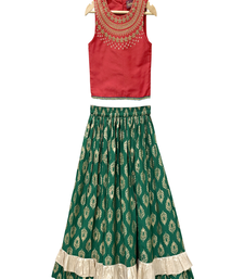 Woven sleeveless placement embroidered top with printed lehenga-red & green