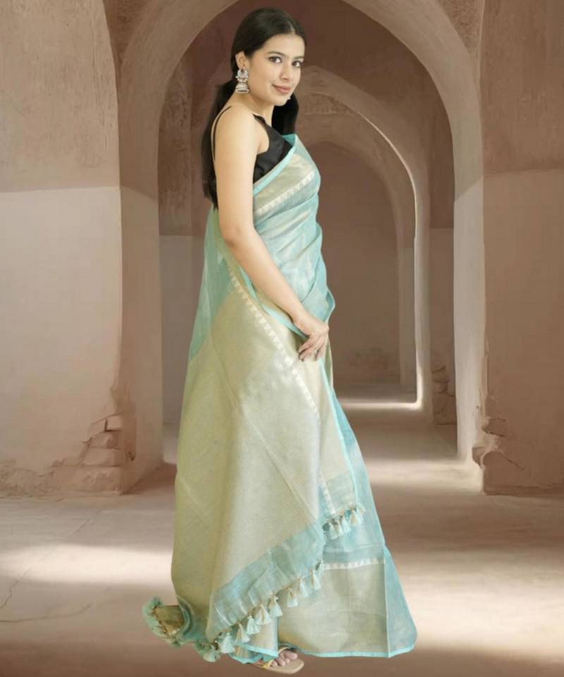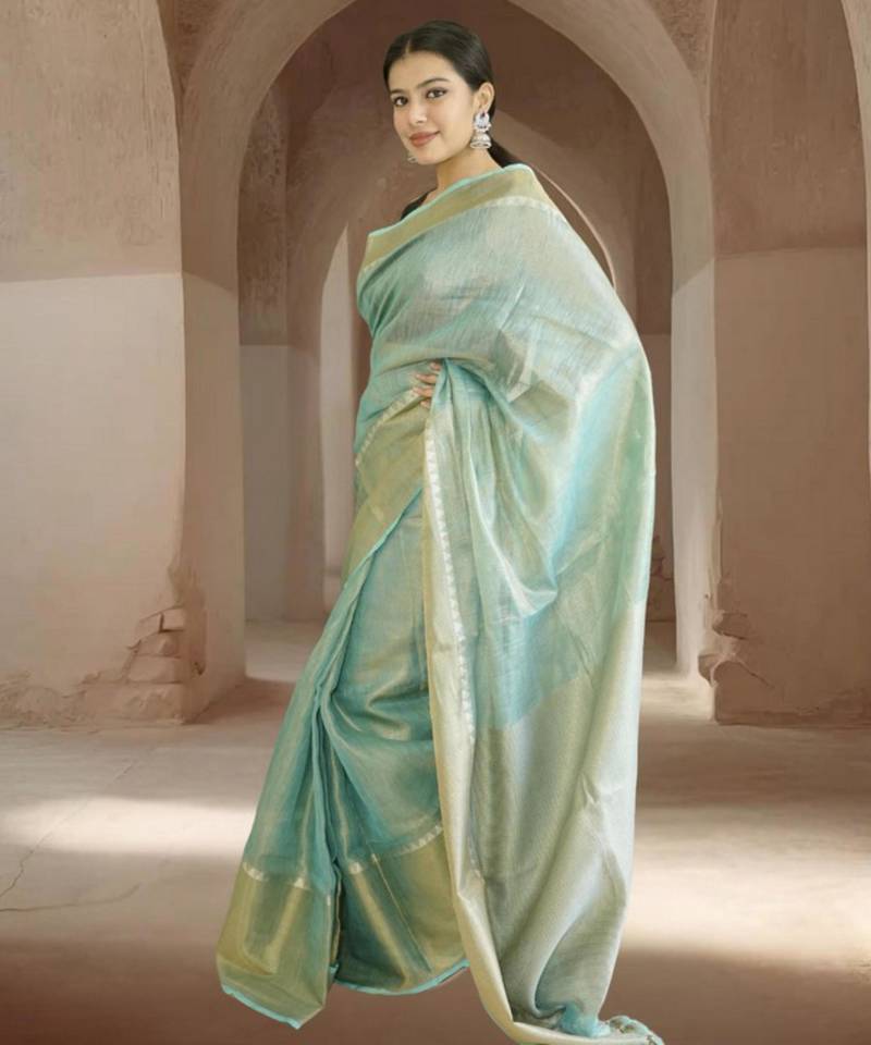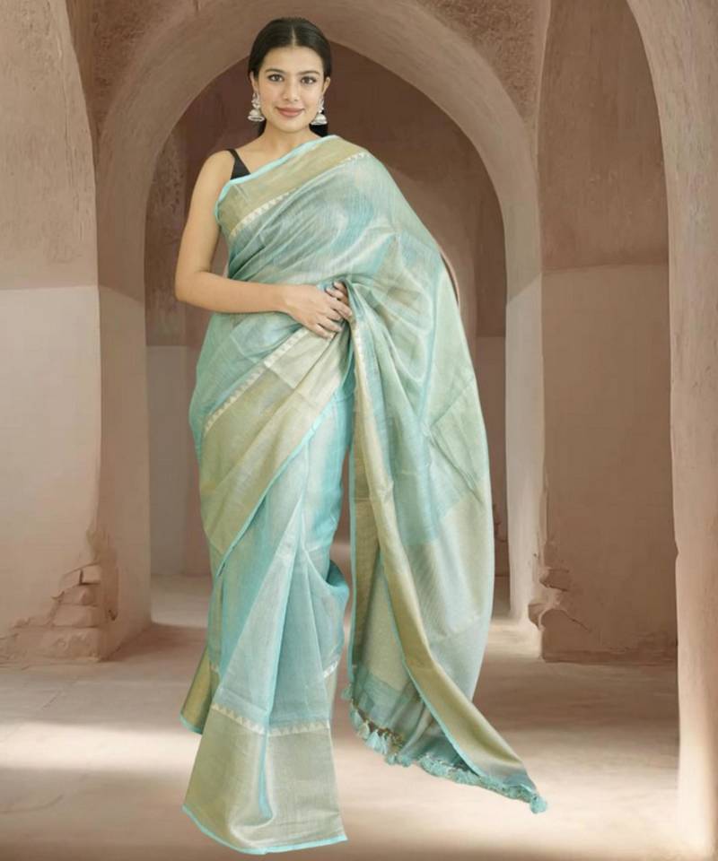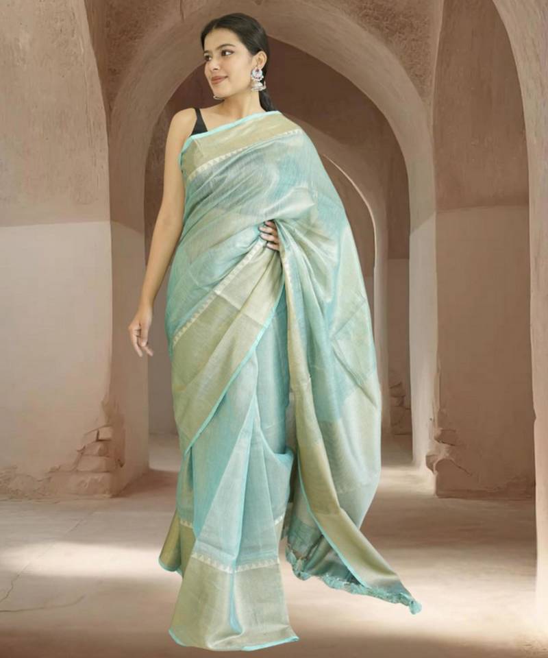 | Product Name | Blue Tissue Linen Saree With Zari Border | |