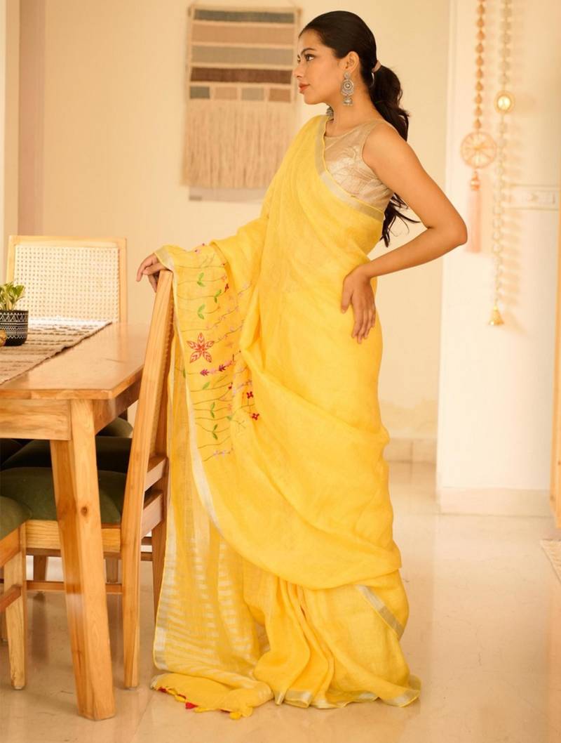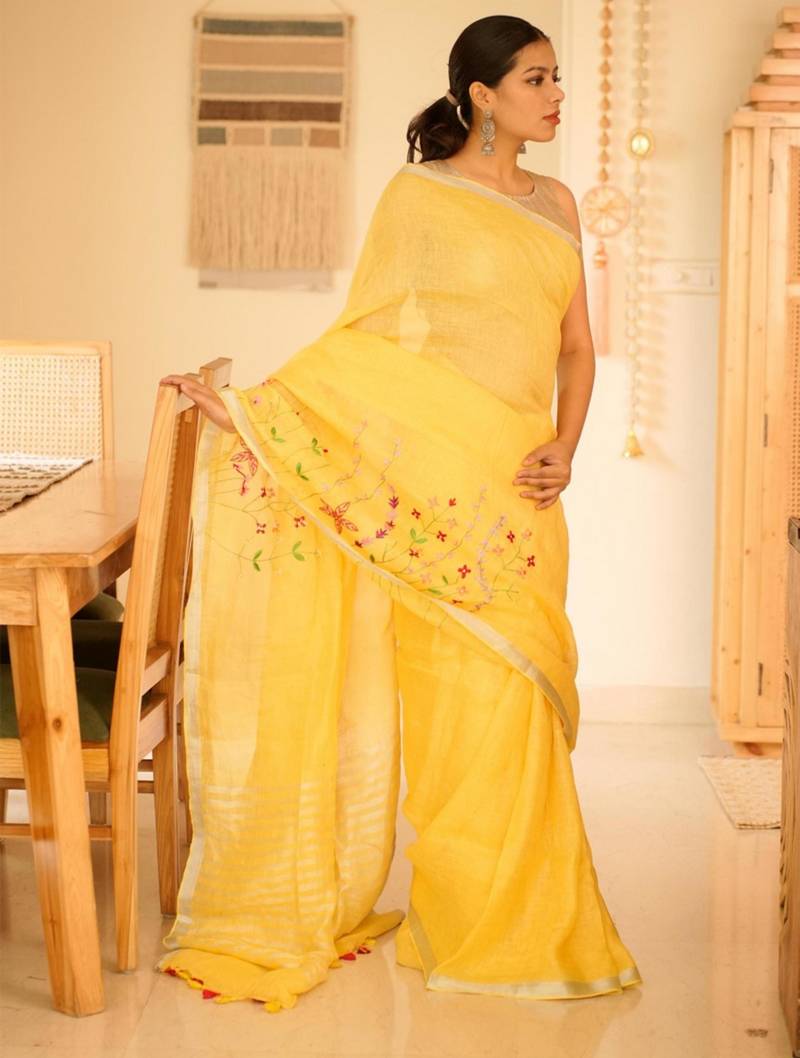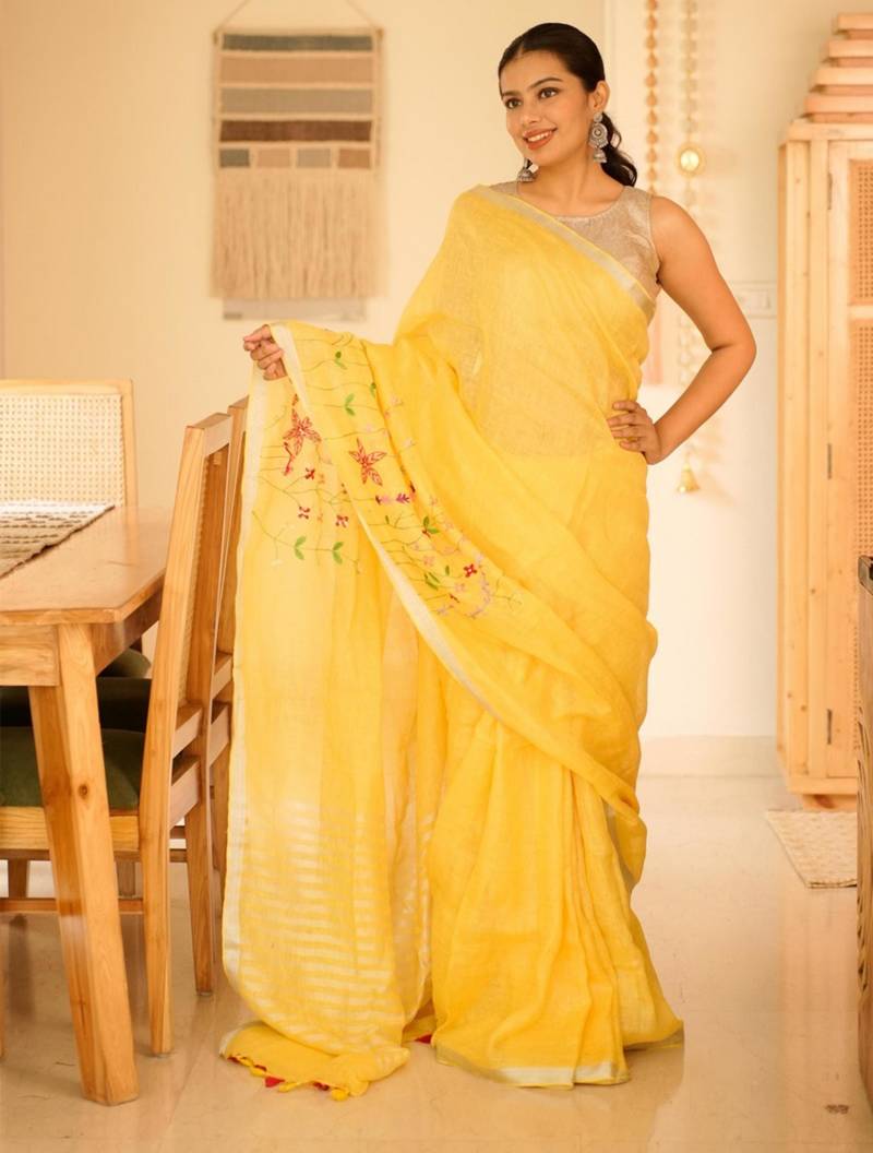 | Product Name | Golden Grace Hand Embroidered Tissue Linen Saree | |