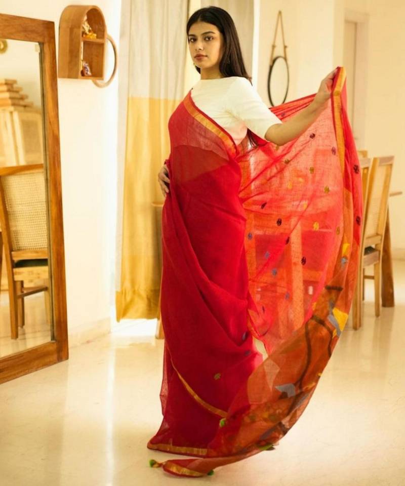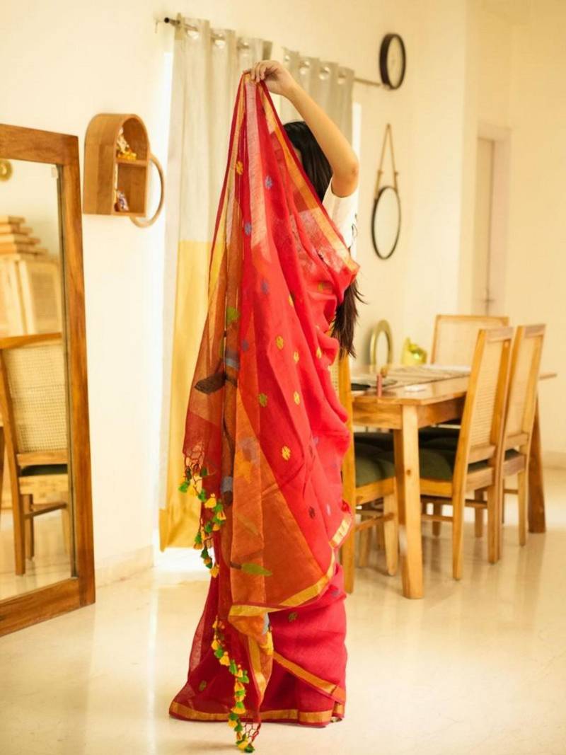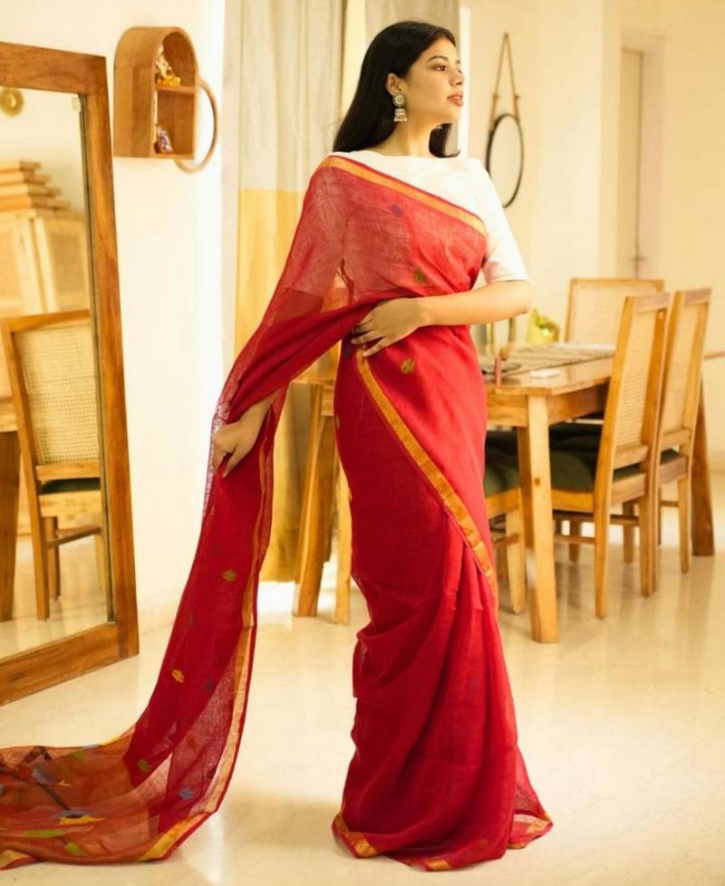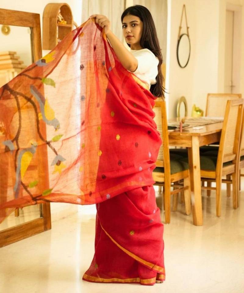| • | Saree | : | Color- Red / Fabric- Linen |