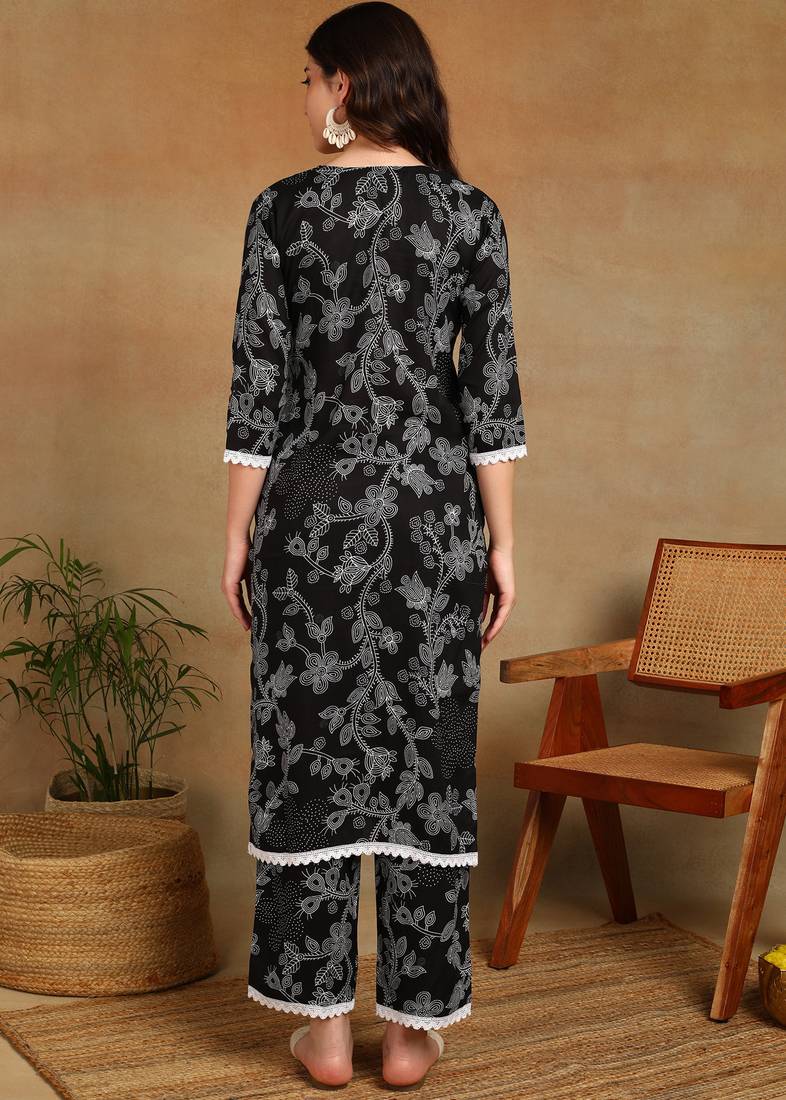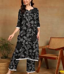 Vahson women's black printed rayon kurta with trousers and lace detailing stitched
