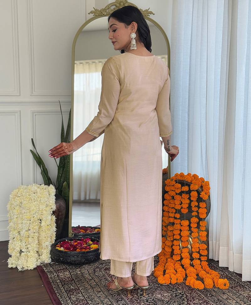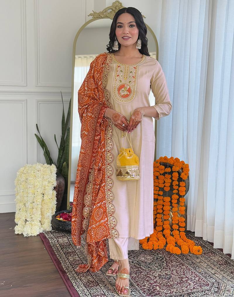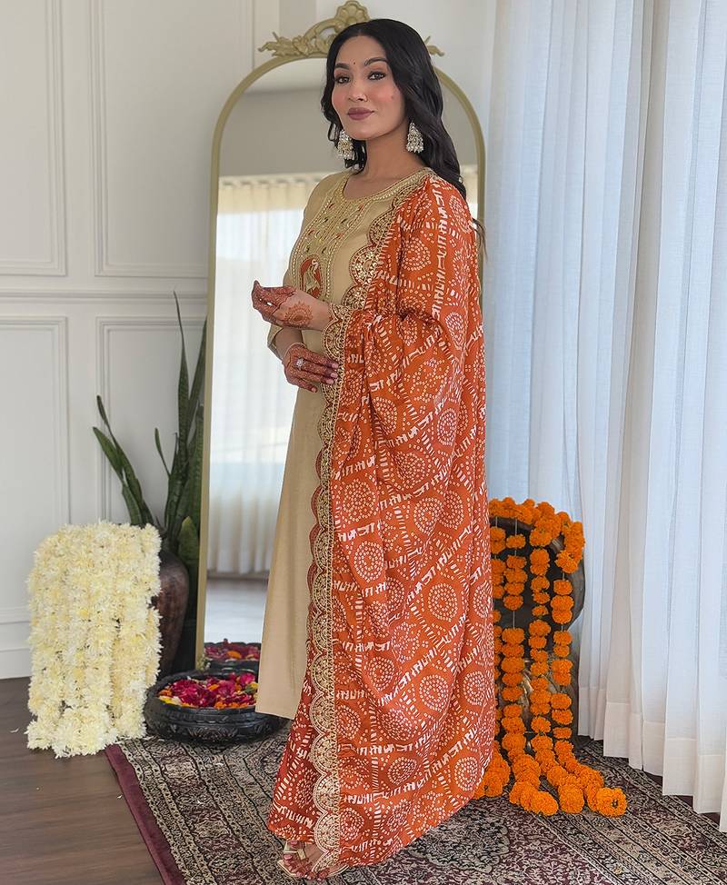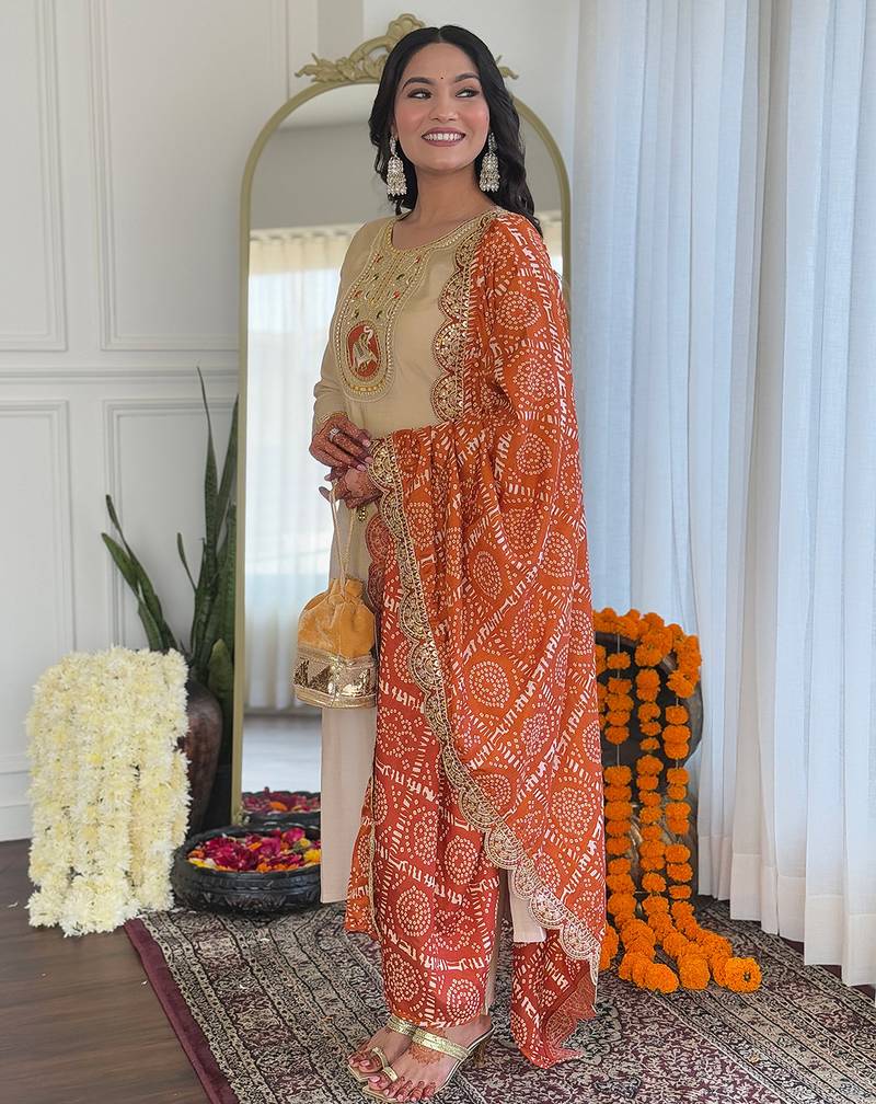Embrace Understated Elegance With This Beautifully Designed Chiku Kurta Set Paired With A Vibrant Orange Bandhani Dupatta, Perfect For Festive And Traditional Occasions. The Kurta Features Intricate Embroidery On The Neckline, Highlighted With Delicate Threadwork And Subtle Embellishments That Add A Refined And Graceful Touch To The Soft Neutral Base.Crafted From Comfortable And Breathable Viscose Fabric, The Straight Cut Kurta Offers A Flattering Silhouette, Making It Ideal For Long Festive Days And Celebrations. The Outfit Is Elevated By The Striking Orange Bandhani Dupatta, Adorned With Traditional Tie Dye Patterns And Finished With An Ornate Scalloped Lace Border, Bringing A Rich Cultural Charm And Vibrant Contrast To The Ensemble.Paired With Matching Bottoms And Styled With A Potli Bag, This Outfit Is A Perfect Choice For Pooja Functions, Festive Gatherings, Haldi Ceremonies, And Family Occasions. Its Blend Of Earthy Tones And Bright Accents Makes It A Timeless Addition To Any Ethnic Wardrobe.