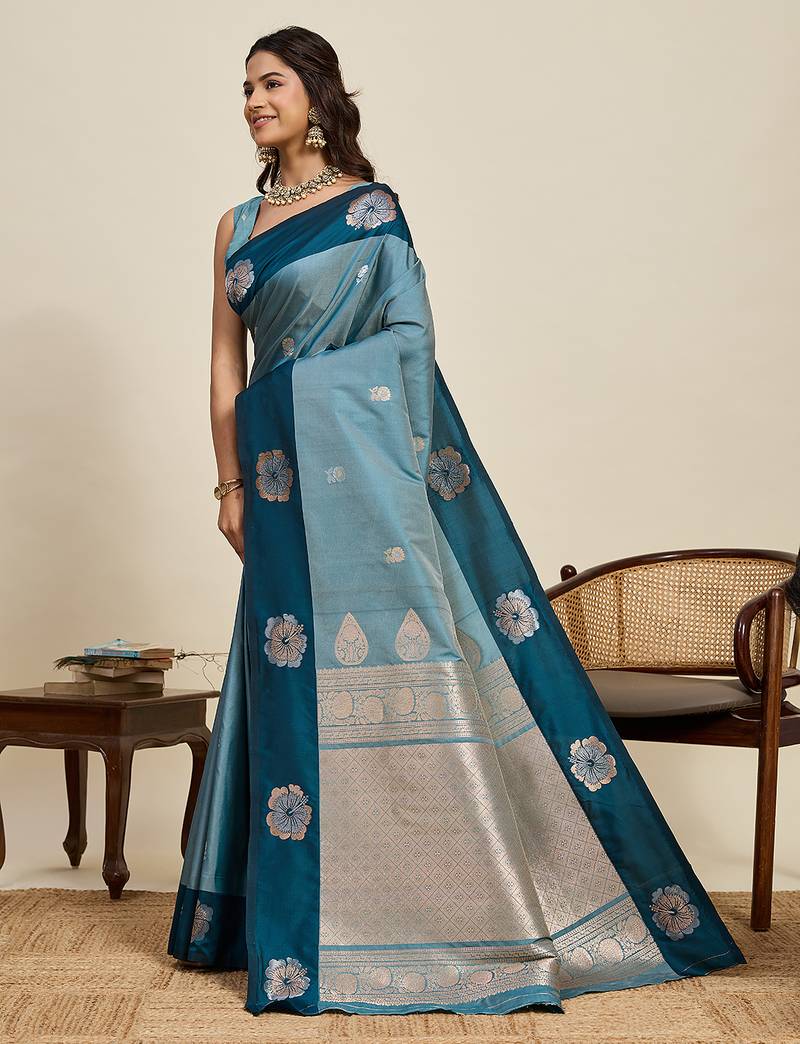 Classic indian teal blue soft silk blend saree for women with unstiched blouse piece