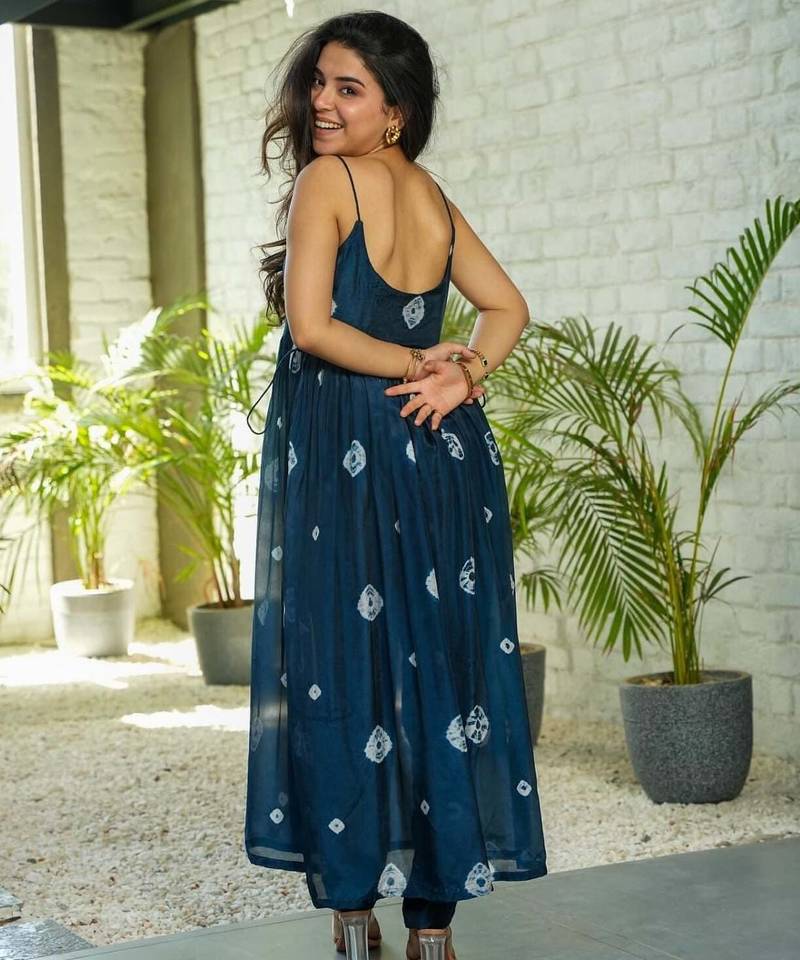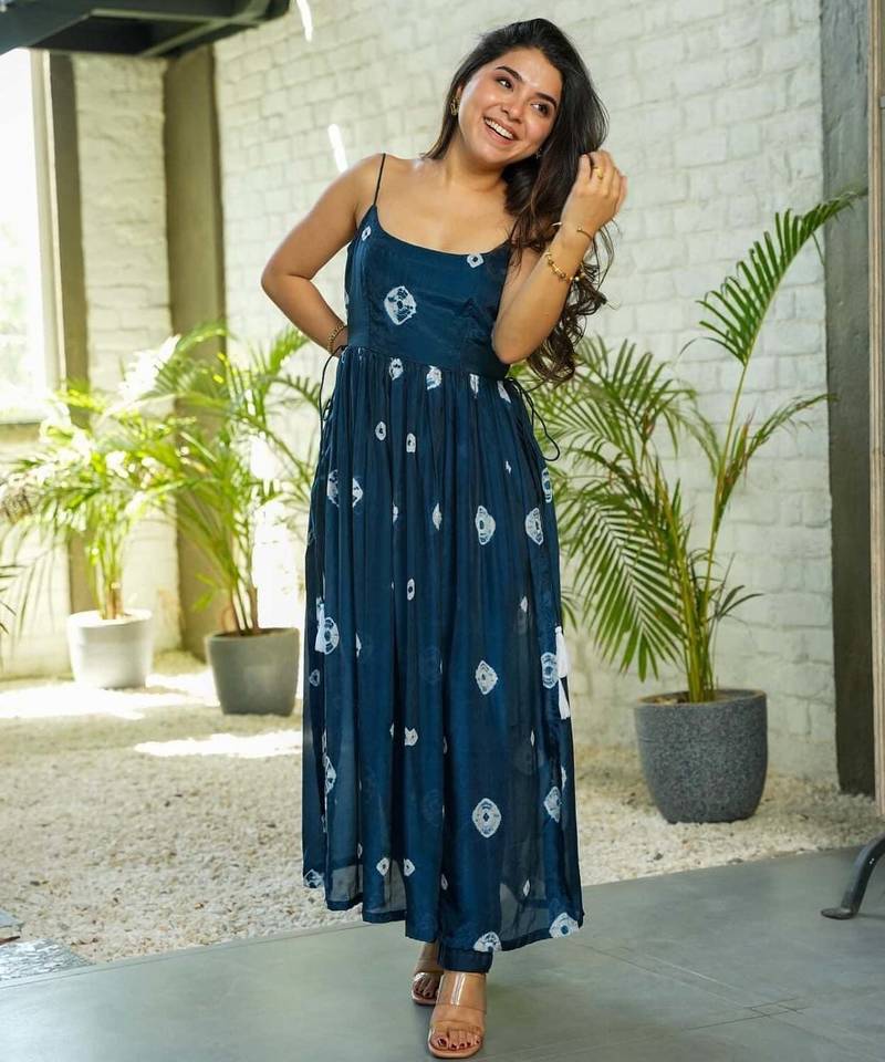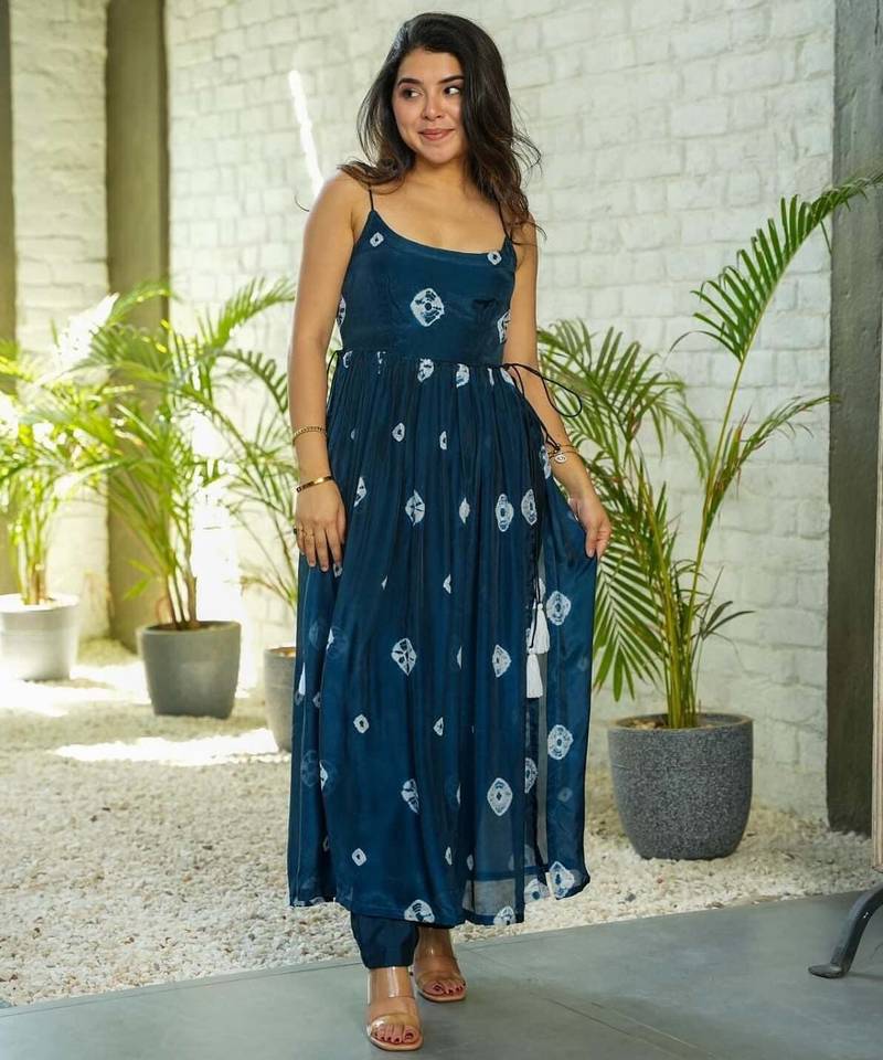 Step Into Effortless Style With This Stunning Navy Blue Anarkali Kurta Set, Designed For Modern Women Who Love Comfort With A Touch Of Elegance. Crafted From Lightweight And Breathable Fabric, This Outfit Offers A Flowy Silhouette That Enhances Movement While Keeping You Comfortable All Day Long.The Kurta Features Delicate Traditional Inspired Prints Scattered Across The Fabric, Giving It A Graceful And Artistic Appeal. Designed With A Sleeveless Pattern And A Gathered Anarkali Flare, It Creates A Soft, Feminine Look That Flatters Every Body Type. The Adjustable Side Tie Ups With Tassel Detailing Add A Charming And Stylish Element To The Outfit.Paired With Matching Fitted Pants, This Ensemble Delivers A Perfect Fusion Of Traditional And Contemporary Fashion. The Deep Navy Blue Color Adds Sophistication, Making It Suitable For Casual Outings, Vacation Wear, Brunch Dates, And Relaxed Festive Occasions.