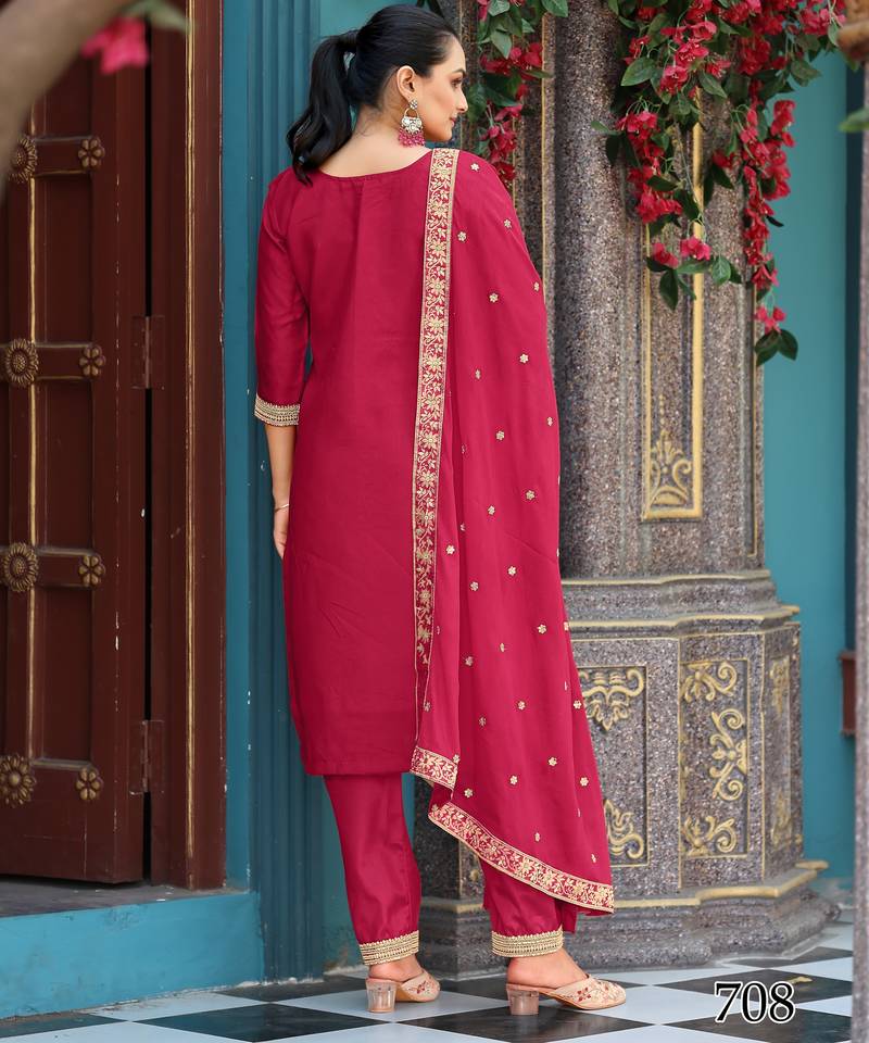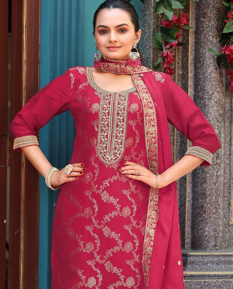 Elegant rani pink viscose jacquard embroidered ethnic kurta set with palazzo & dupatta unstitched