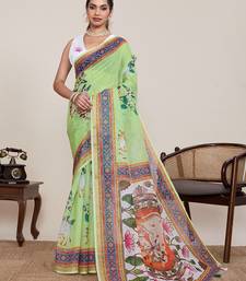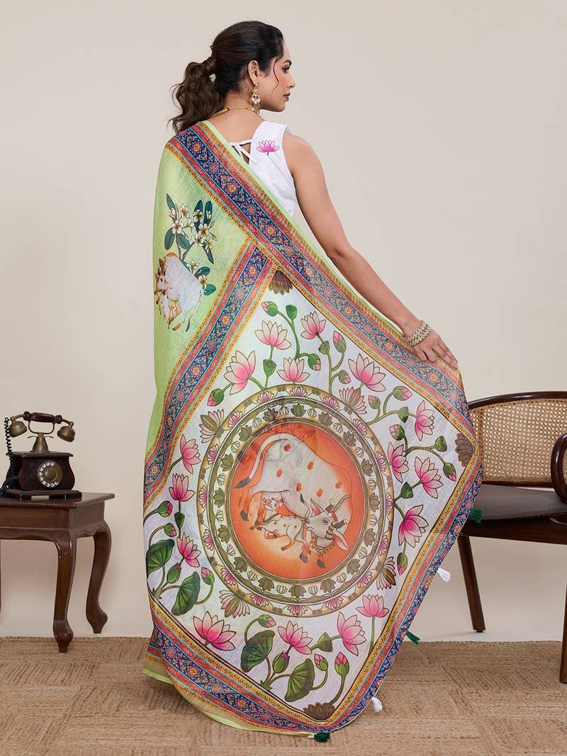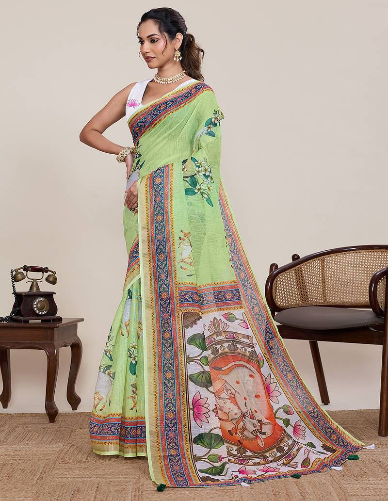 Product Name Light Green Linen Saree With Animal Print Wear For Women With Unstiched Blouse