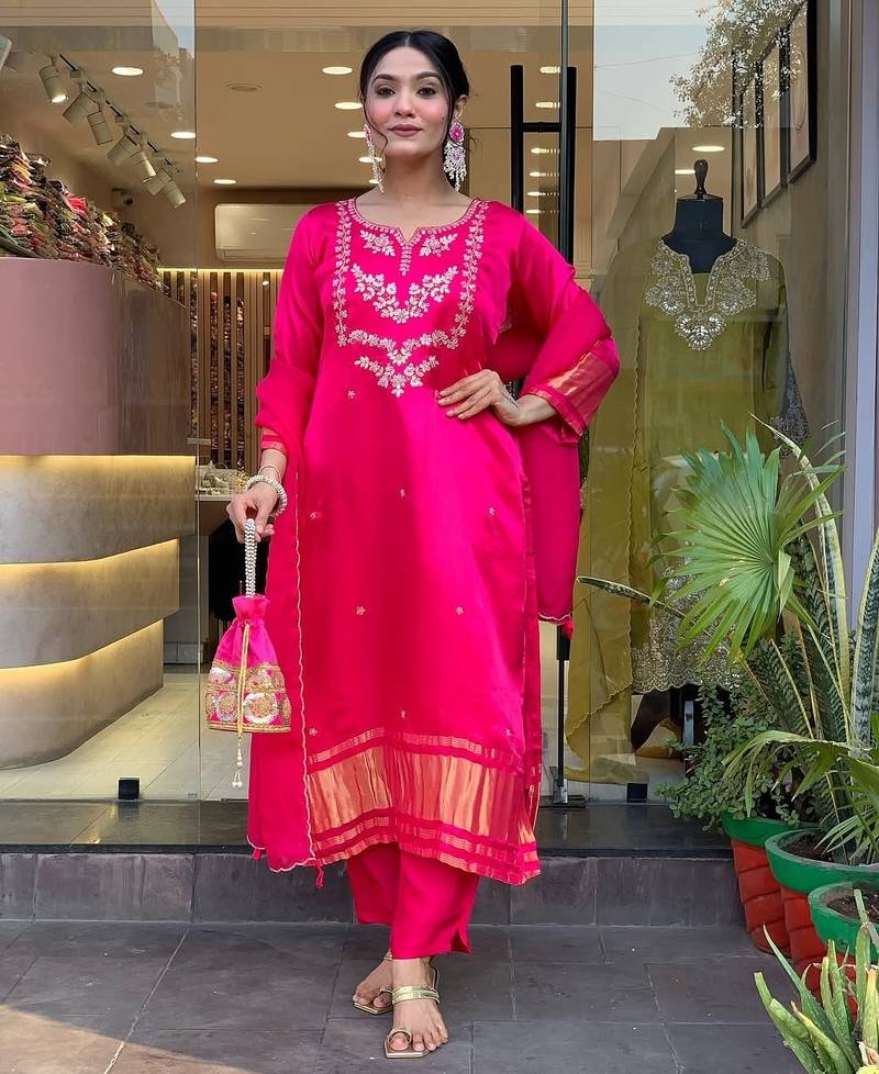 Rani Pink Embroidered Viscose Silk Kurta Set With Dupatta & Pant For Women