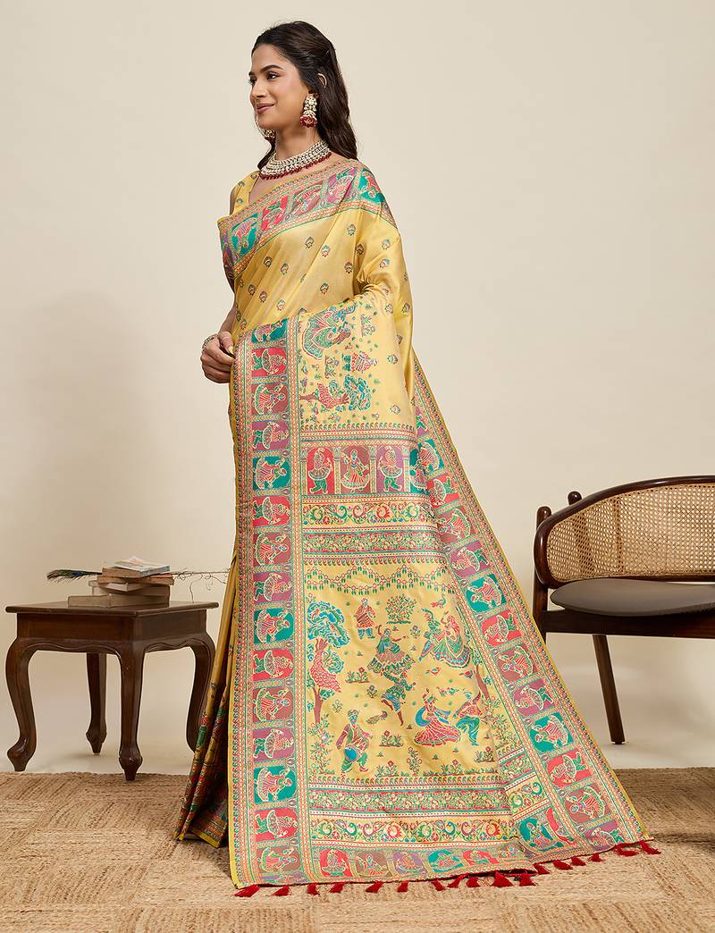 Royal paithani soft silk blend saree in vibrant yellow with contrast border and unstiched blouse piece