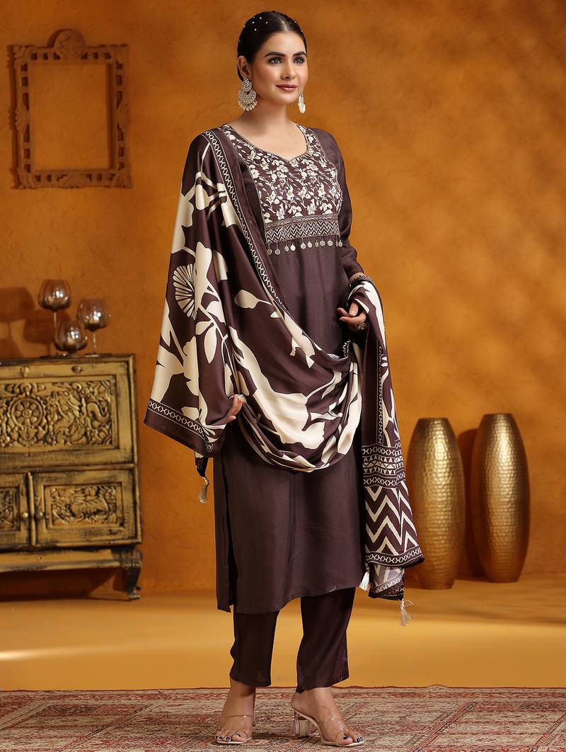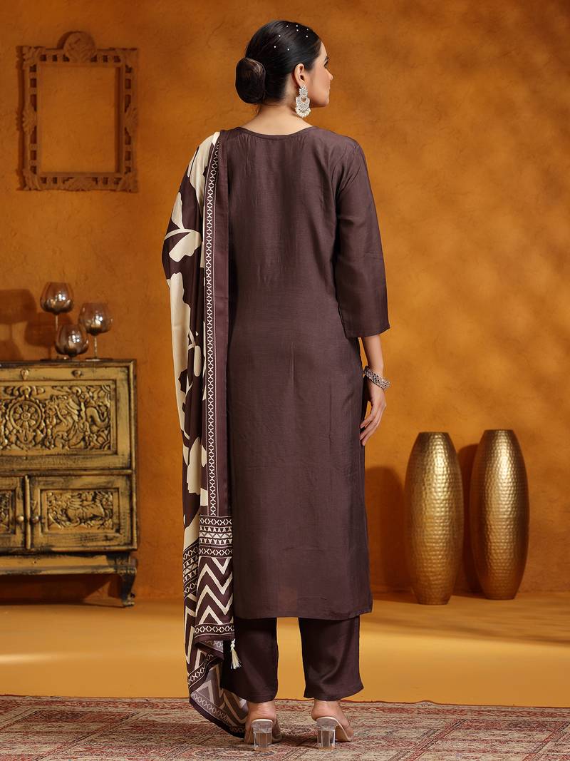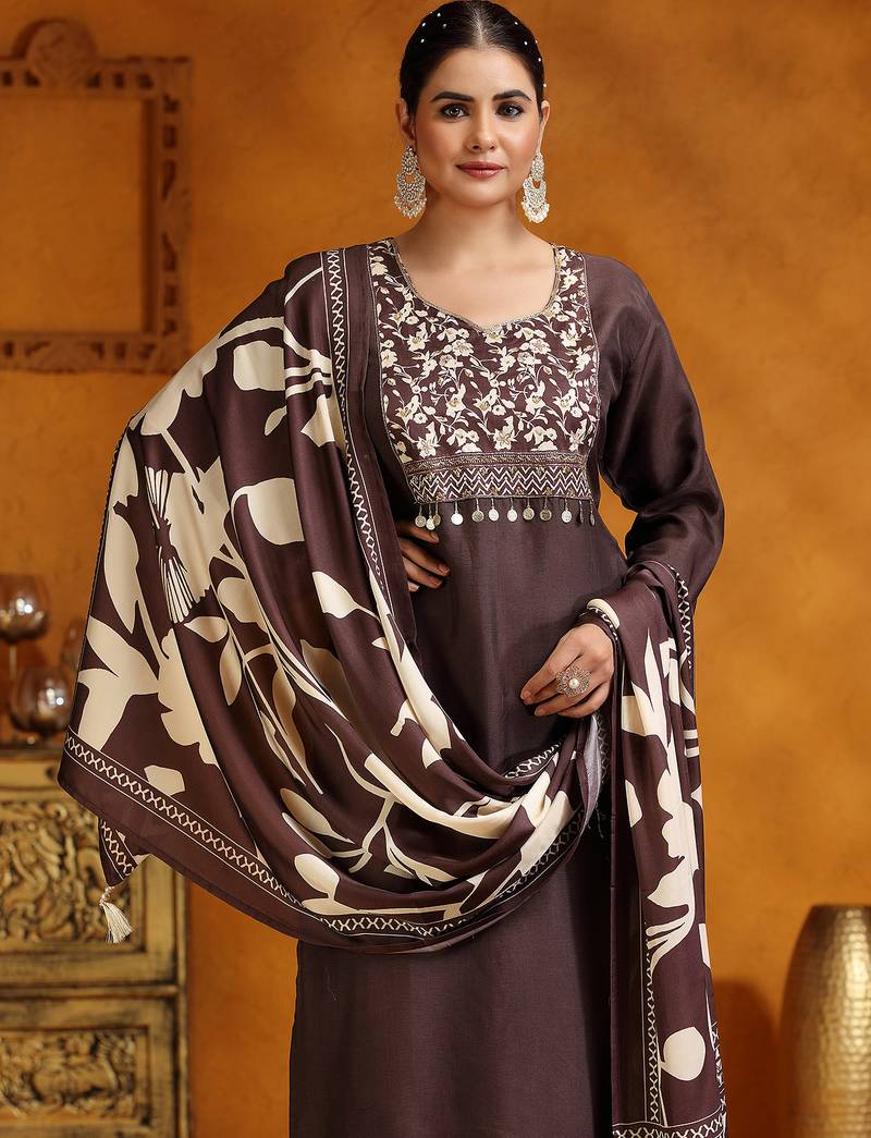 Grey Embroidered Kurta Set With Floral Yoke Work And A Statement Printed Dupatta. Elegant, Lightweight And Perfect For Festive Wear, Office Celebrations And Ethnic Day Outings Elevate Your Ethnic Wardrobe With This Elegant Kurta Set, Designed For Women Who Love Timeless Style With A Modern Touch. Crafted In A Rich Solid Tone, The Kurta Features A Beautifully Embroidered Yoke With Delicate Ethnic Motifs That Add A Refined And Graceful Appeal. The Straight Silhouette Ensures A Flattering Fit, Making It Ideal For Everyday Wear, Festive Gatherings, Office Wear, Or Casual Celebrations.Paired With Matching Pants, This Kurta Set Offers Both Comfort And Sophistication. The Highlight Of The Ensemble Is The Contrast Printed Dupatta, Adorned With Bold Floral Motifs And Geometric Border Detailing That Creates A Striking Visual Balance. The Dupatta Drapes Effortlessly, Adding Movement And Elegance To The Overall Look.
