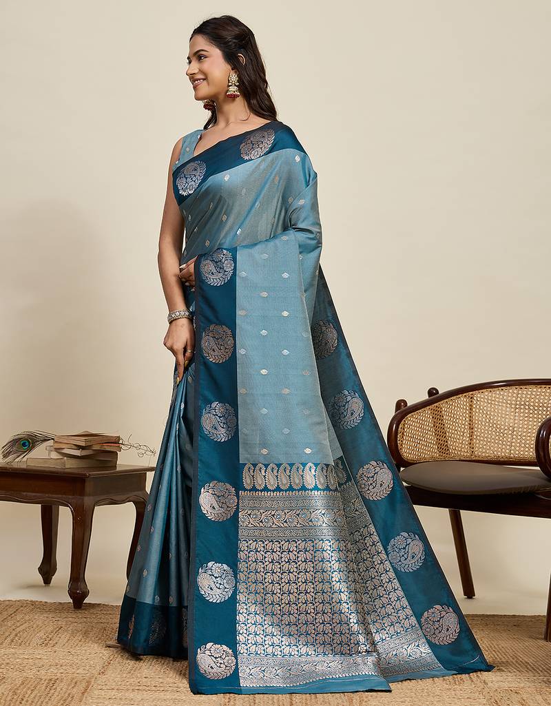 Stylish women's teal blue soft silk blend indian wear saree with unstiched blouse piece