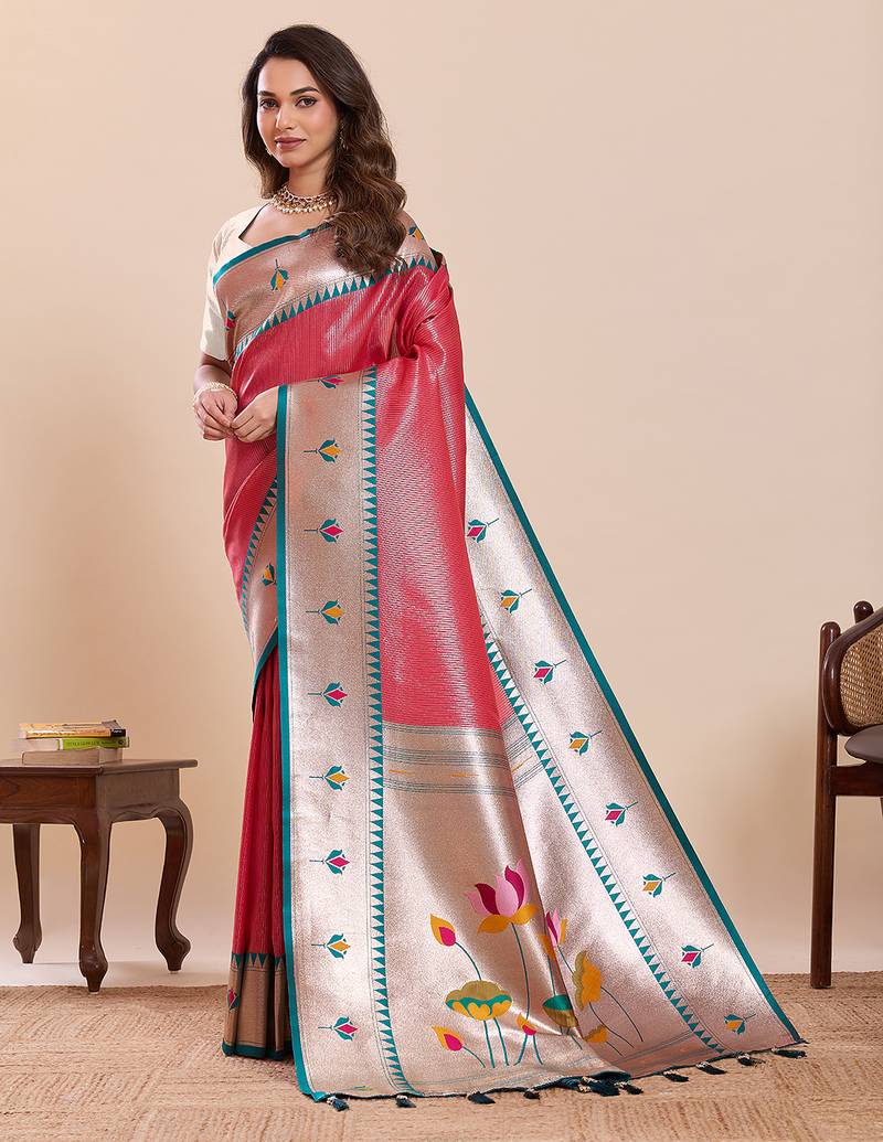 Traditional dark pink paithani soft silk saree with rich weaving & classic motifs comes with unstiched blouse piece