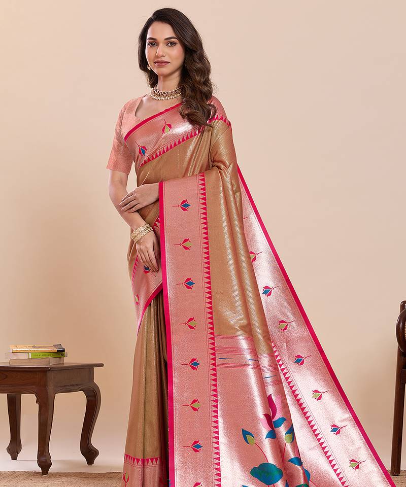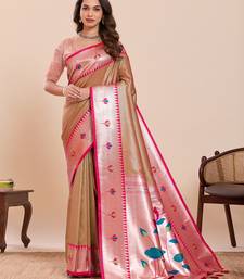 Traditional pink paithani soft silk blend saree with rich weaving & classic motifs comes with unstiched blouse piece