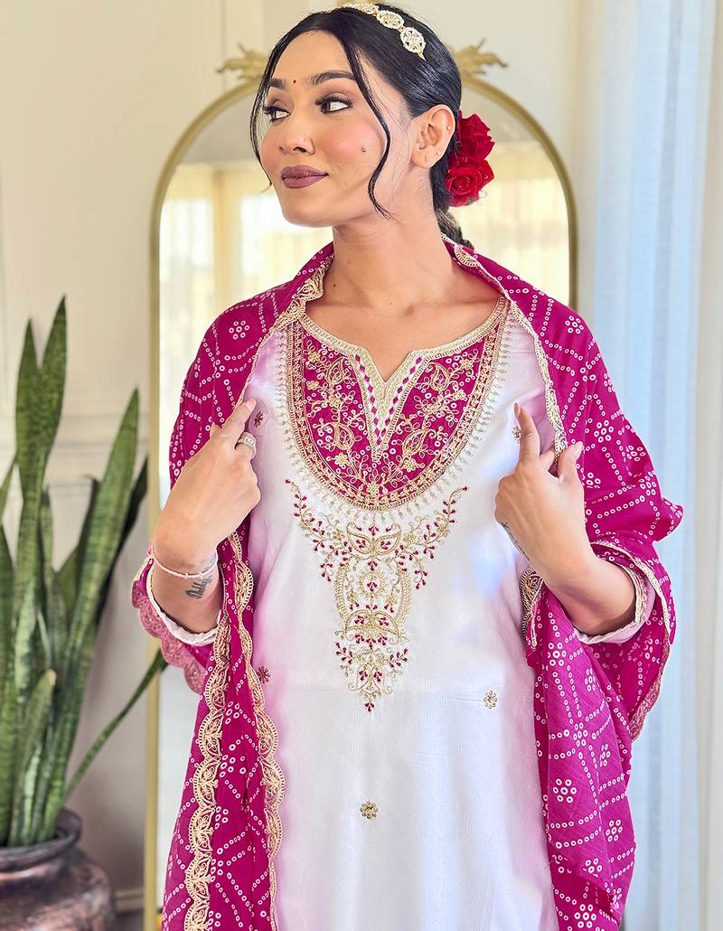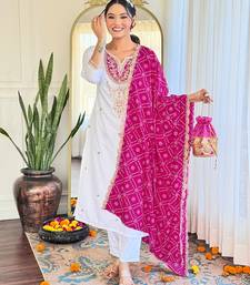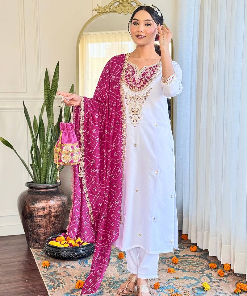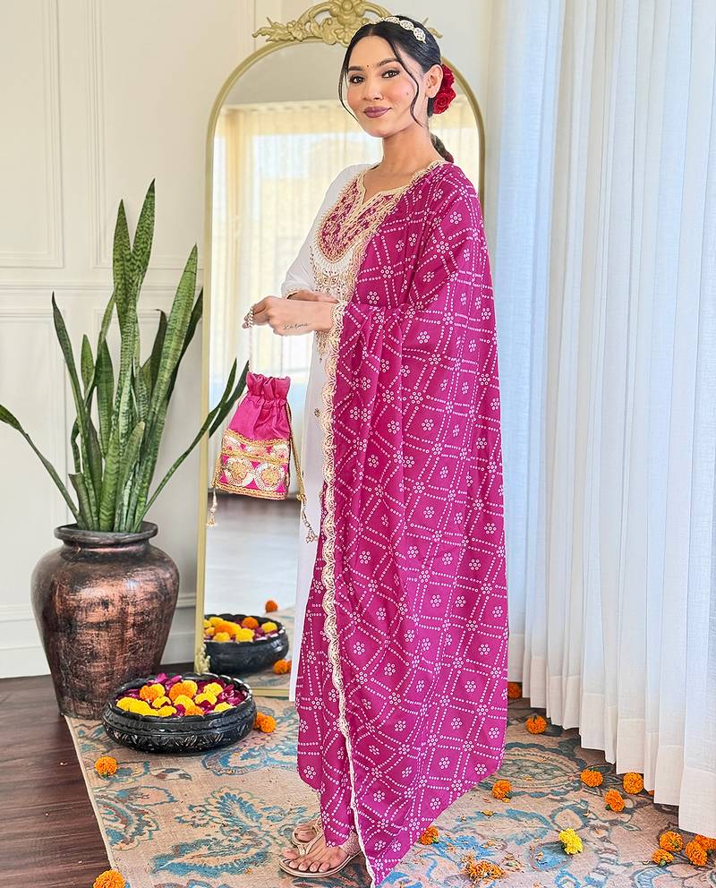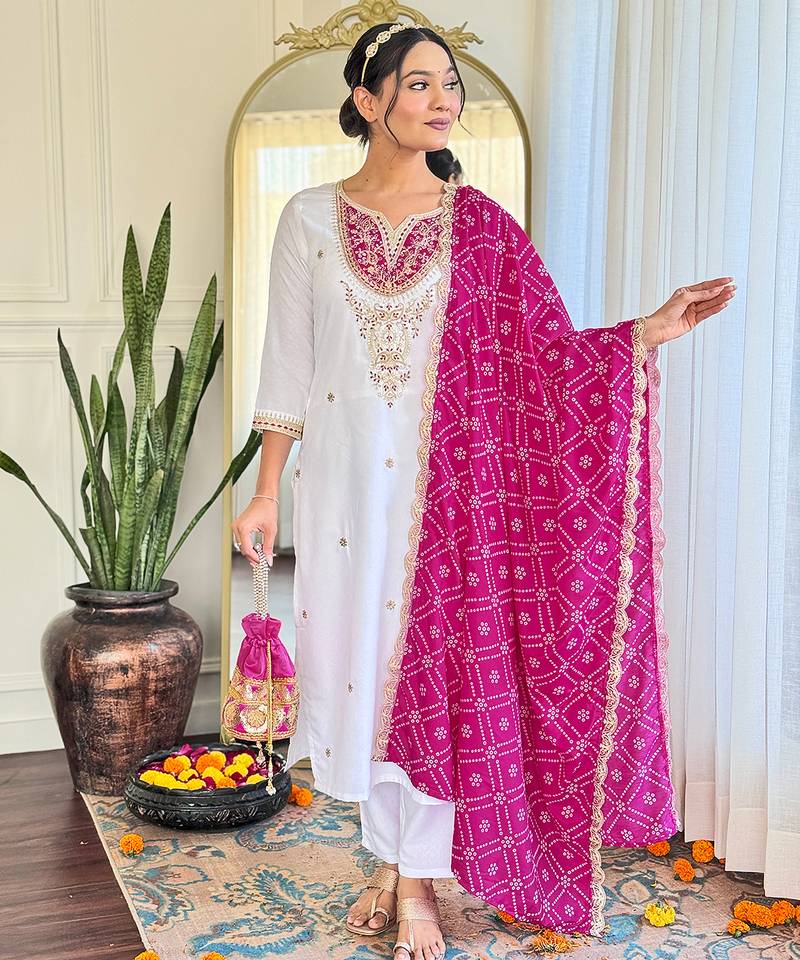 Step Into Effortless Elegance With This Graceful White Kurta Set Paired With A Vibrant Pink Bandhani Dupatta, Designed To Bring A Perfect Blend Of Simplicity And Festive Charm. The Kurta Features Delicate Embroidery On The Neckline With Subtle Golden Scattered Across The Fabric, Adding A Refined And Sophisticated Touch. Crafted From Comfortable And Breathable Fabric, It Ensures All Day Ease While Maintaining A Polished Ethnic Look.The Highlight Of The Outfit Is The Striking Pink Bandhani Dupatta, Adorned With Traditional Patterns And Finished With An Elegant Lace Border That Enhances Its Festive Appeal. This Beautiful Contrast Adds Brightness And Cultural Richness To The Overall Ensemble. Complemented With Straight Fit Pants, This Outfit Is Ideal For Festive Occasions, Family Gatherings, Pooja Functions, And Casual Celebrations.Style It With Ethnic Juttis And Minimal Jewelry For A Chic, Graceful Appearance That Perfectly Balances Tradition And Modern Aesthetics.