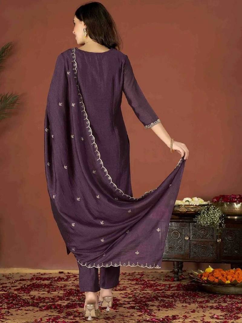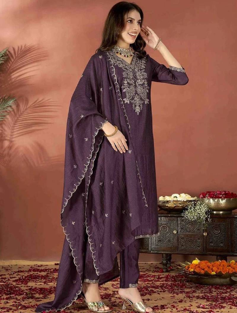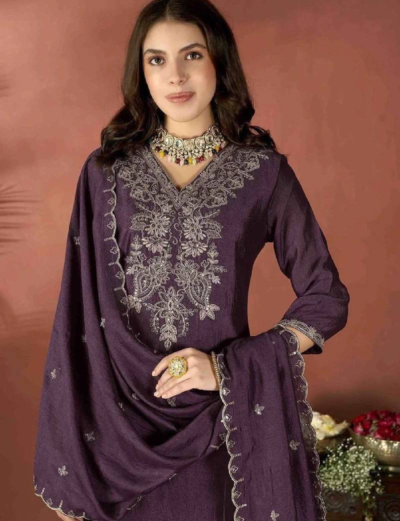 Product Name Wine Embroidered Vichitra Kurta Set With Dupatta & Pant