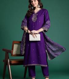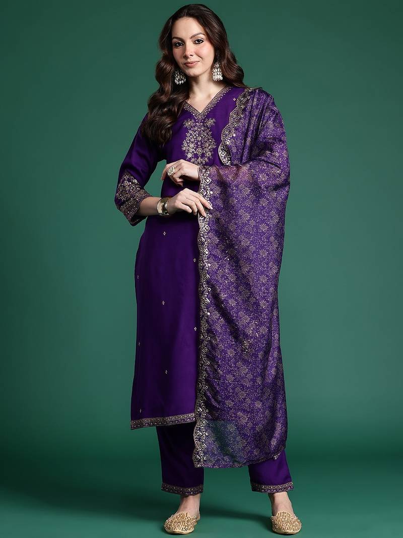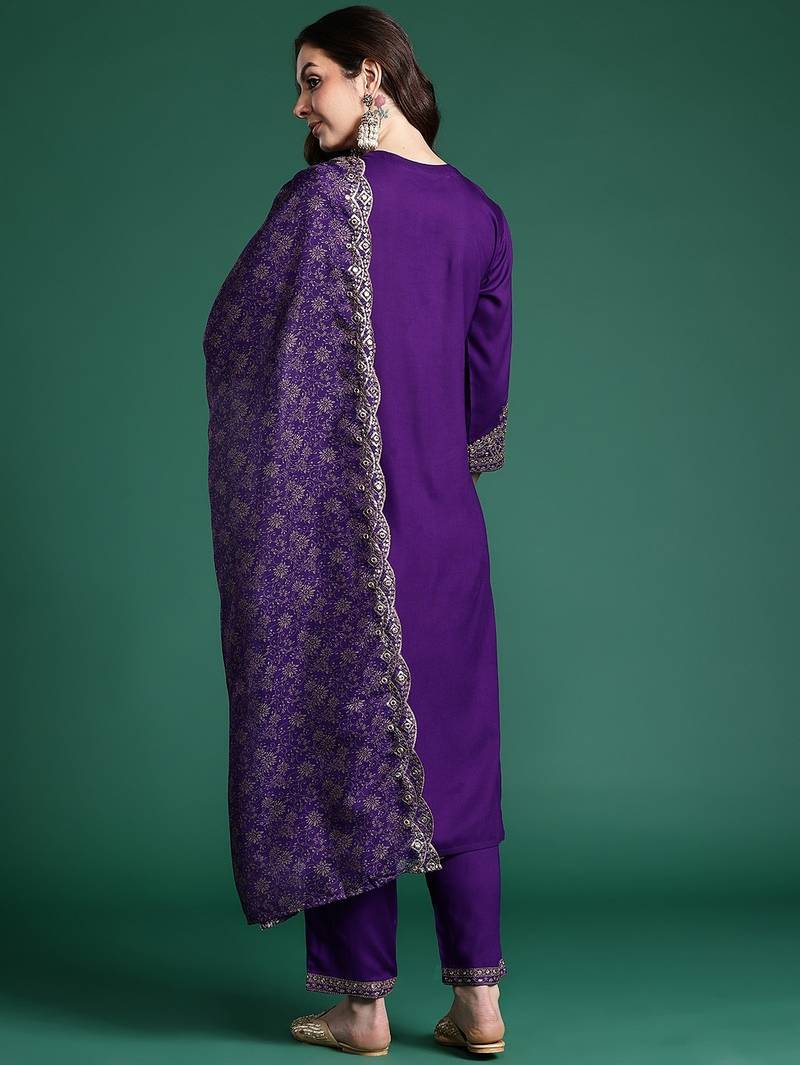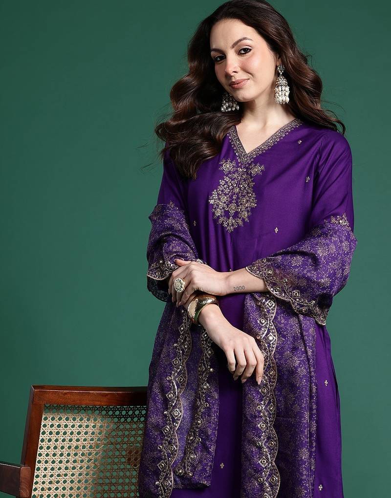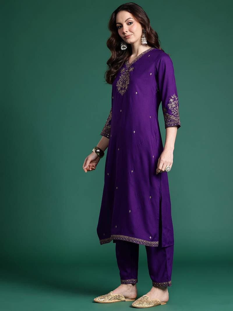 Add Royal Elegance To Your Ethnic Collection With This Indo Purple Embroidered Kurta Set, Designed For Women Who Appreciate Refined Craftsmanship And Timeless Style. This Outfit Is An Ideal Choice For Festive Occasions, Weddings, Family Functions, And Elegant Evening Wear.The Kurta Features A Classic Straight Cut Silhouette That Offers Both Comfort And Sophistication. The Highlight Of The Design Is The Intricately Embroidered Yoke, Adorned With Fine Thread Embroidery And Subtle Zari Accents, Forming Elegant Floral And Traditional Motifs. The Embroidery Is Tastefully Balanced To Give A Rich Look Without Appearing Heavy.The Kurta Body Showcases A Solid Purple Base Enhanced With Small Buti Style Embroidered Motifs, Evenly Placed To Add Texture And Visual Interest. The V Neckline Is Finished With Decorative Embroidered Edging, Elevating The Neckline With A Premium Handcrafted Touch.
