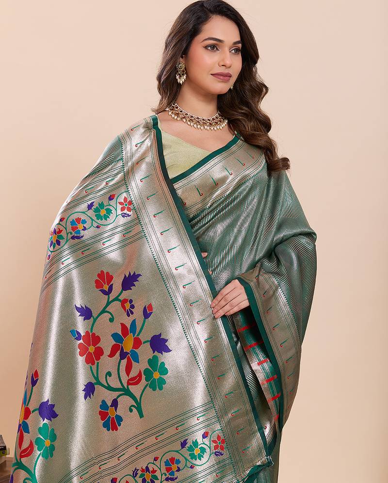 Women's flower paithani green soft silk blend saree with zari weaving & rich floral motifs