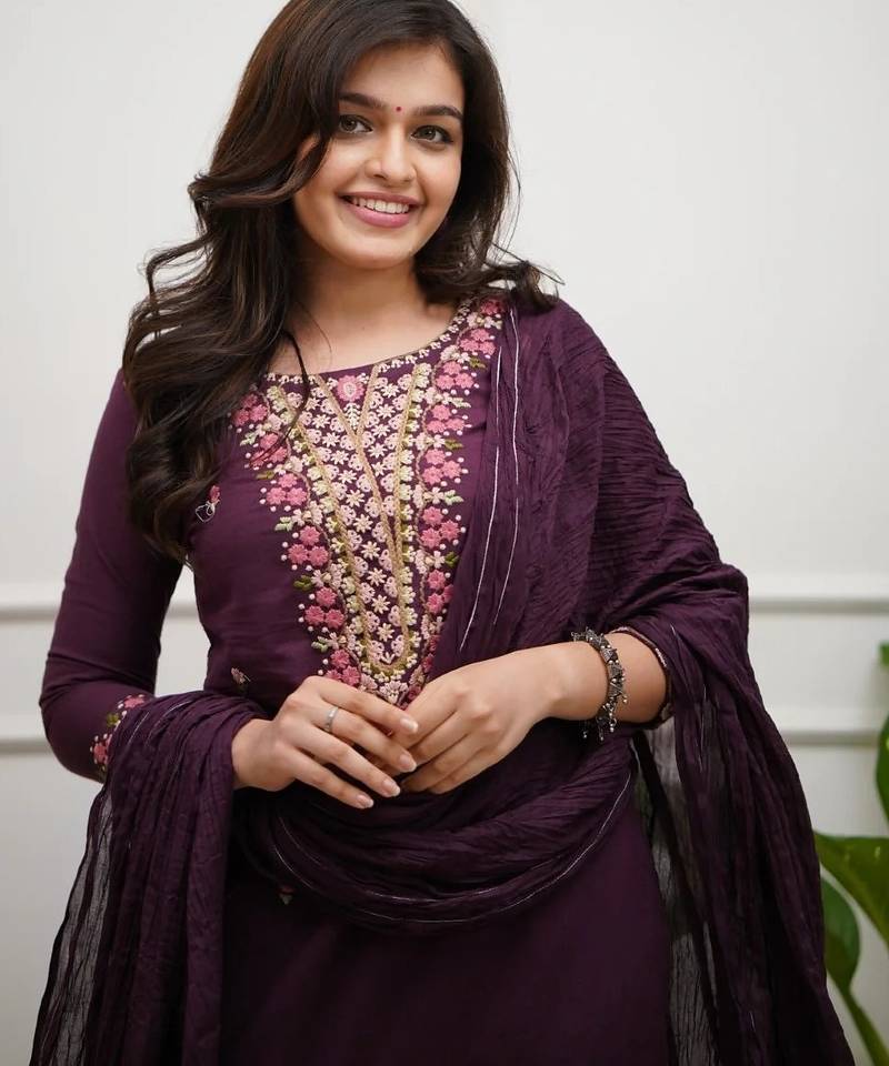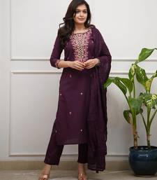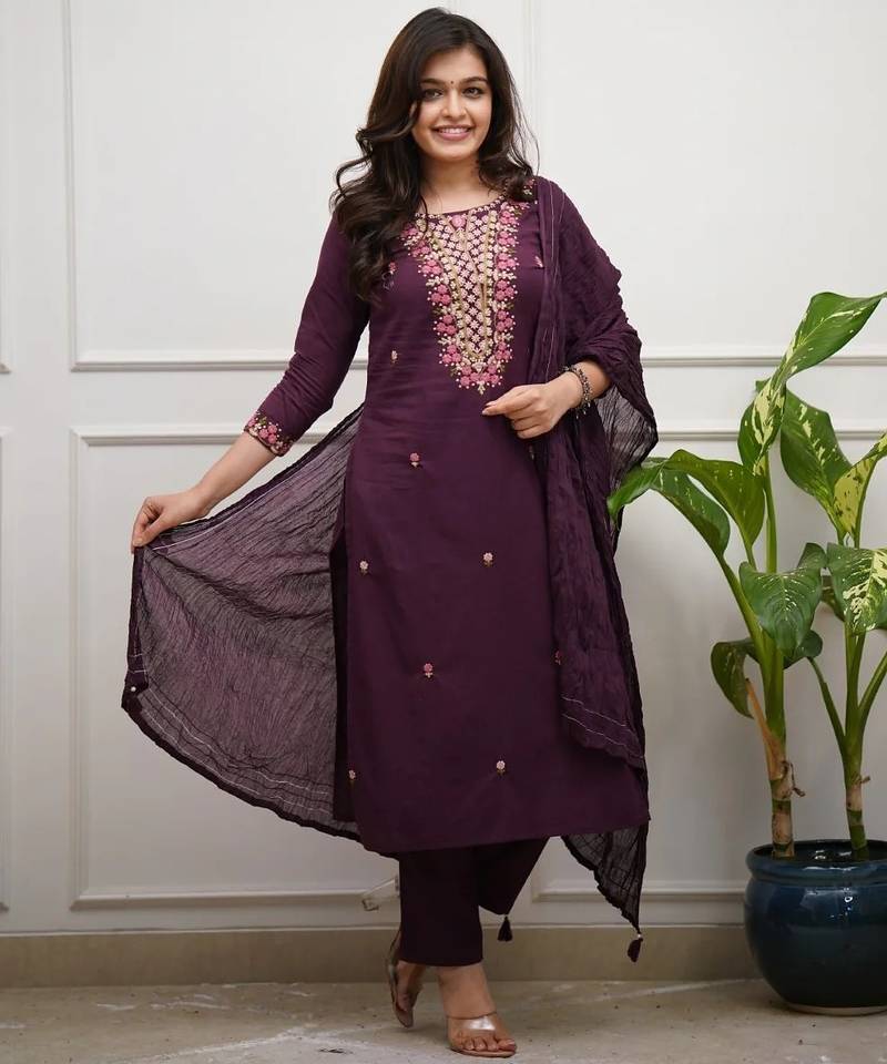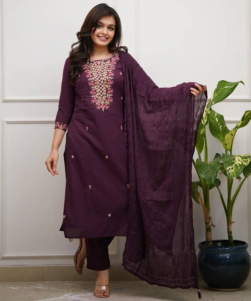 Enhance Your Ethnic Wardrobe With This Timeless Deep Plum Embroidered Kurta Set, Designed For Effortless Elegance And Everyday Comfort. Crafted In A Rich Solid Hue, The Kurta Features Beautifully Detailed Floral Thread Embroidery On The Neckline, Adding A Touch Of Femininity And Traditional Charm Without Being Overpowering.The Straight Cut Silhouette Is Adorned With Delicate Embroidered Butti Work, While The Lightweight Crinkle Dupatta Lends Graceful Movement And A Soft, Elegant Drape. Paired With Matching Bottoms, This Set Is Ideal For Women Who Appreciate Minimal Sophistication Blended With Classic Ethnic Aesthetics.Perfect For Festive Gatherings, Office Celebrations, Family Functions, Pooja Ceremonies, And Elegant Day Wear, This Kurta Set Is Versatile, Breathable, And Stylish Across Seasons. Style It With Statement Earrings And Heels Or Flats For A Polished Ethnic Look.
