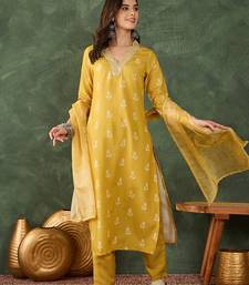 Enhance Your Ethnic Wardrobe With This Mustard Yellow Printed Kurta Set, Designed To Reflect Understated Elegance And Timeless Indian Craftsmanship. Perfect For Women Who Appreciate Subtle Prints And Refined Detailing, This Kurta Set Is Ideal For Festive Celebrations, Office Wear, Daily Ethnic Styling, And Casual Gatherings.The Kurta Features Delicate All Over Small Floral Booti Print Work, Inspired By Traditional Indian Block Printing Techniques. The Evenly Spaced Booti Motifs Add A Graceful And Balanced Charm To The Outfit, Making It Visually Pleasing Yet Minimal. The Rich Mustard Yellow Base Beautifully Highlights The Soft Contrast Of The Printed Motifs, Creating A Warm And Elegant Look.The Neckline Is Enhanced With Intricate Printed And Lace Style Detailing, Forming A Refined V Neck Design That Adds Sophistication And Ethnic Appeal. The Neckline Work Elevates The Simplicity Of The Kurta, Giving It A Polished And Premium Finish. The Sleeves And Hemline Maintain A Clean Silhouette, Allowing The Delicate Print Work To Stand Out.Complementing The Kurta Is A Matching Lightweight Dupatta Featuring Subtle Woven Patterns And Elegant Border Detailing. The Dupatta Adds Fluidity And Movement To The Ensemble, Enhancing The Overall Grace Of The Outfit Without Overpowering The Minimal Print Design.