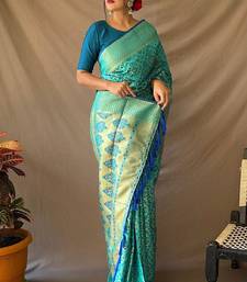 Aqua blue woven self design embellished pure silk banarasi saree with blouse