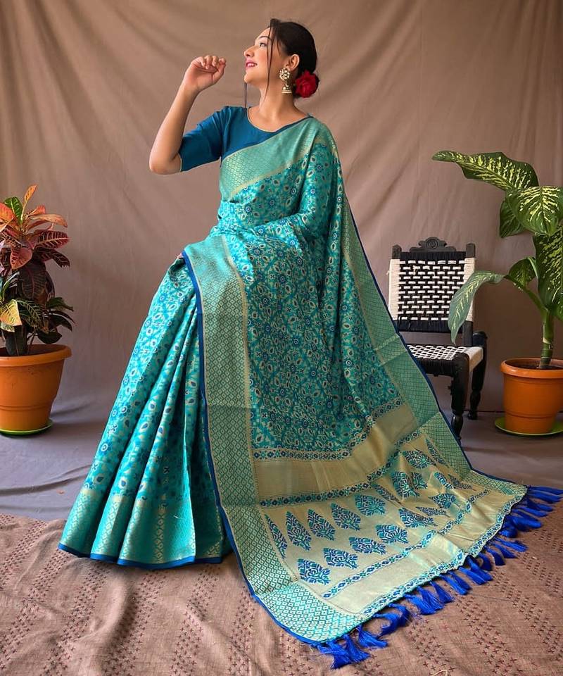| Product Description | Presenting Banarasi Sarees For Intimate And Big Fat Indian Weddings, That Are Light On Your Skin And Uplift Your Wedding. Fabric : Pure Patola Silk Saree With All Over Contrast Patola Weaved With Contrast Meenakari And Rich Pallu With Tassels Attached |