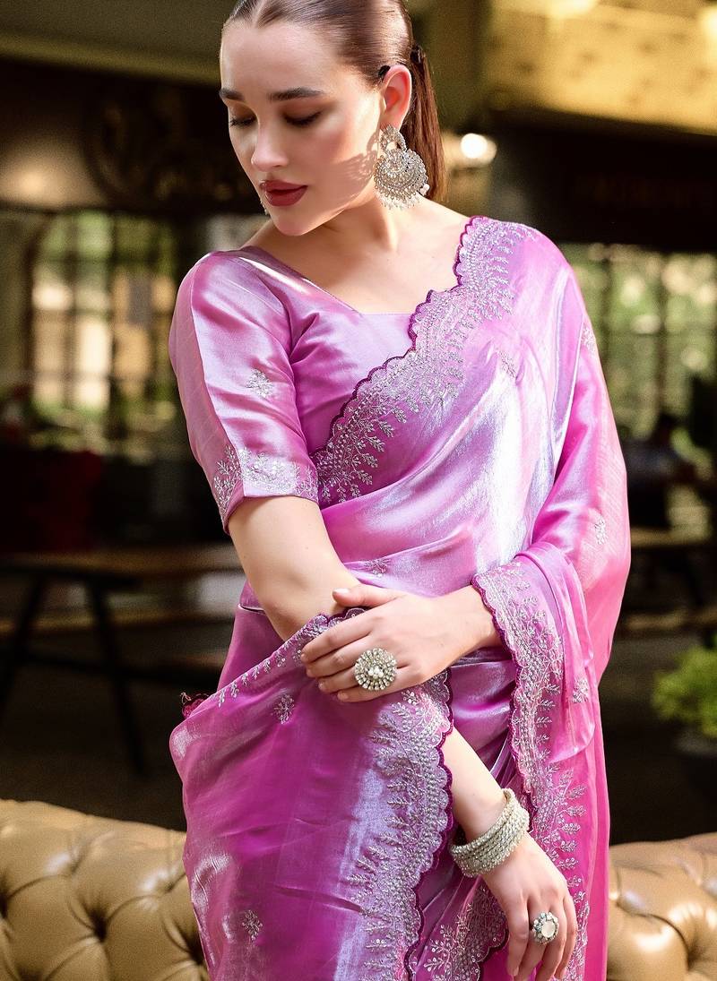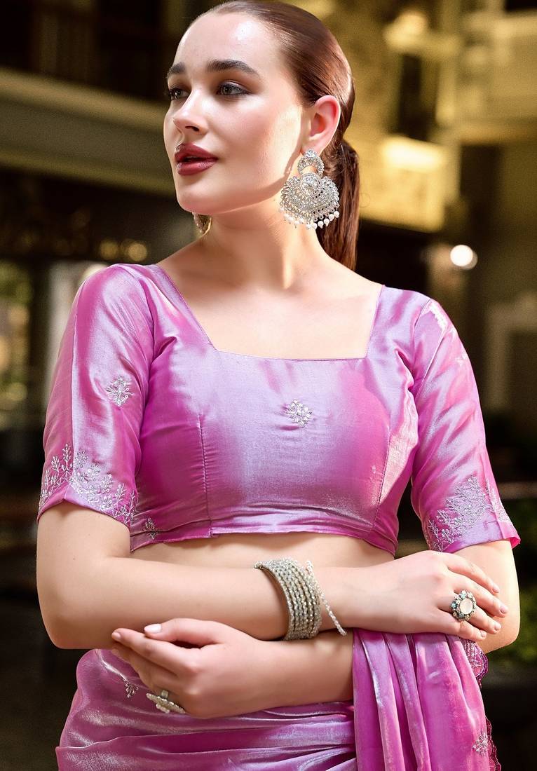 Baby pink embroidered embellished shimmer chiffon bollywood saree with blouse