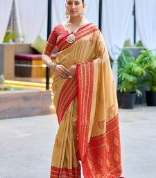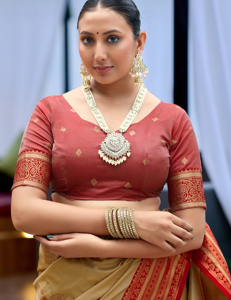 Beige woven silk blend paithani saree with blouse