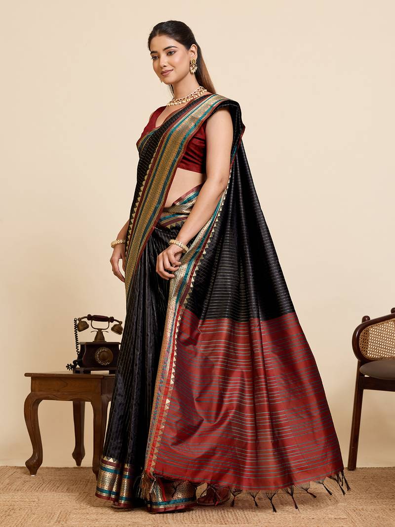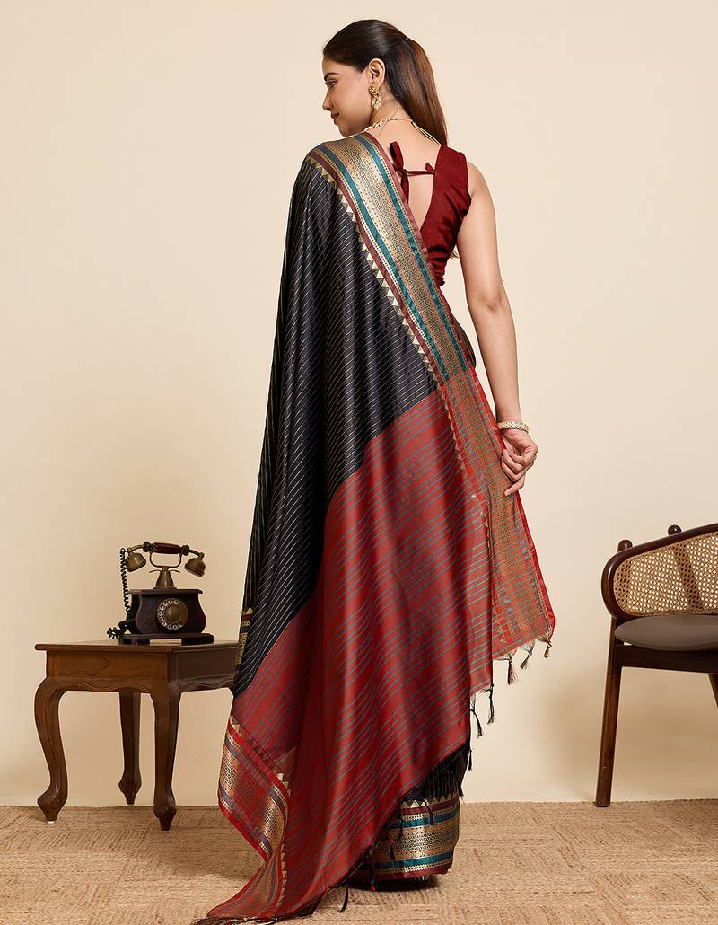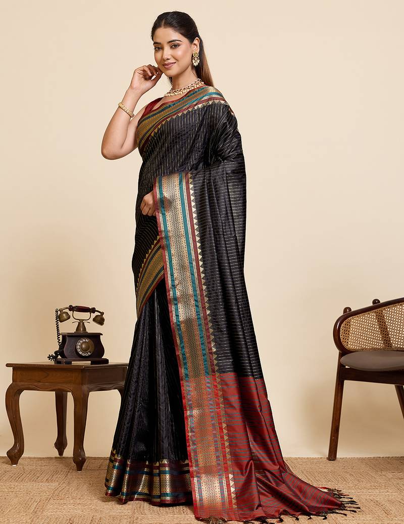Black striped pure silk banarasi saree with blouse