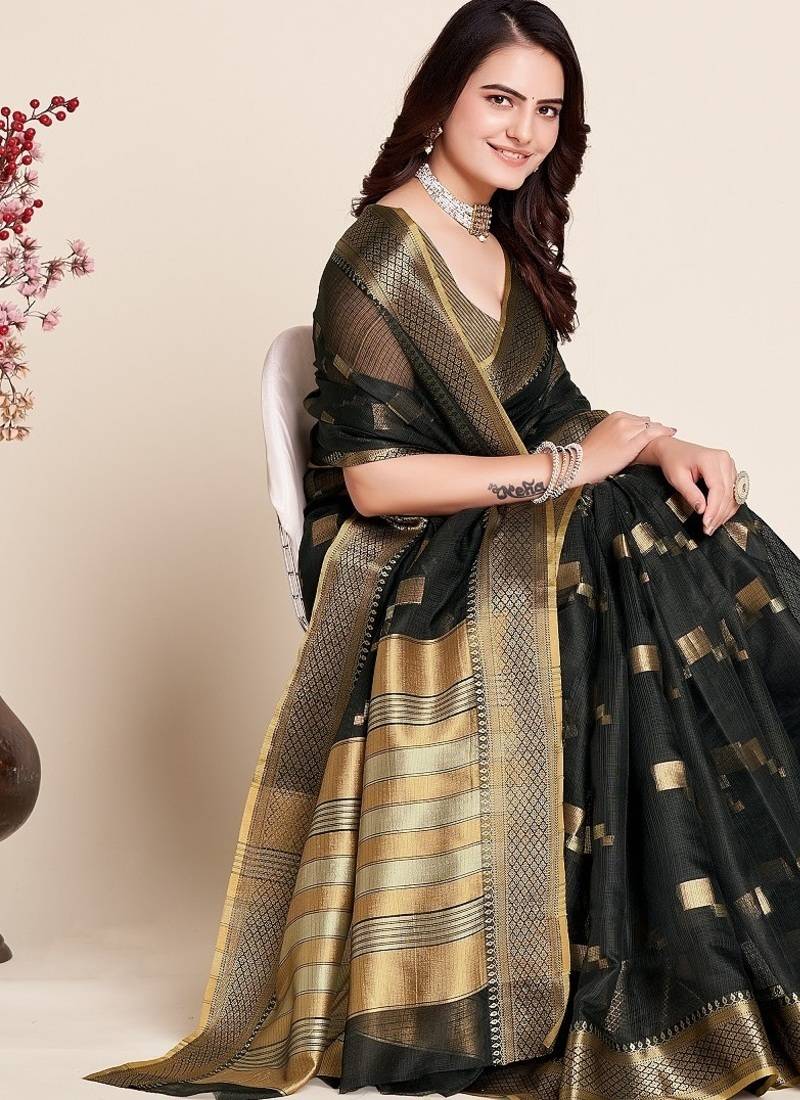 Black woven self design kota doria kota doria saree with blouse