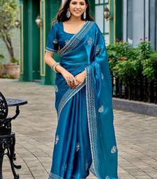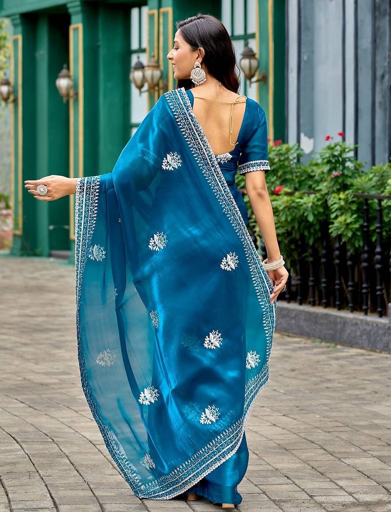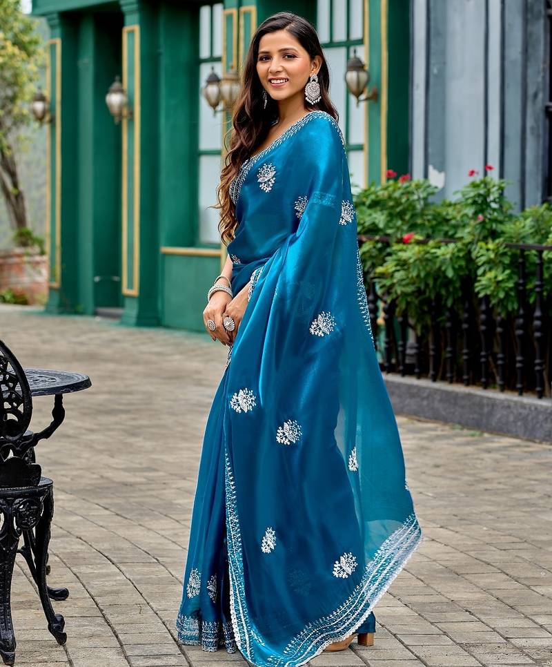 Blue embroidered embellished shimmer chiffon bollywood saree with blouse