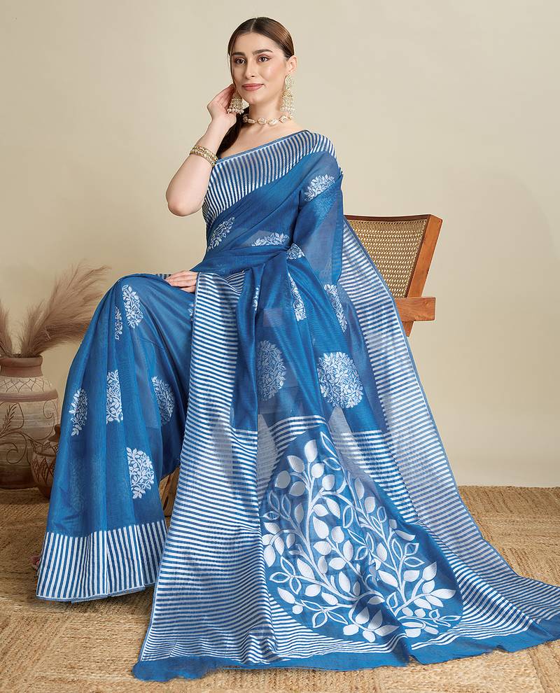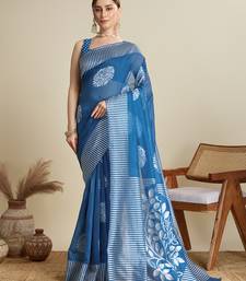 Blue floral print silk blend bollywood saree with blouse