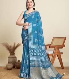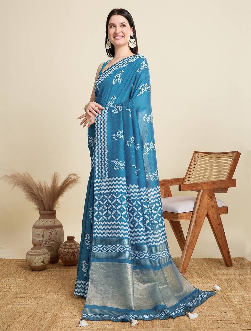 Blue printed color block embellished cotton silk bollywood saree with blouse