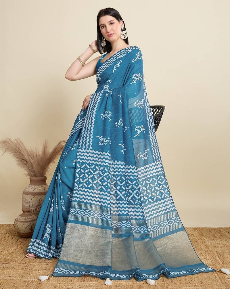 | Product Name | Blue Printed Color Block Embellished Cotton Silk Bollywood Saree With Blouse | |