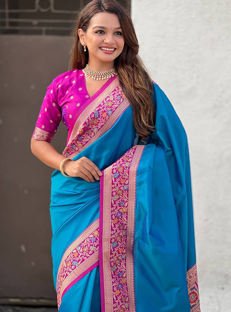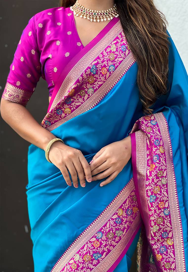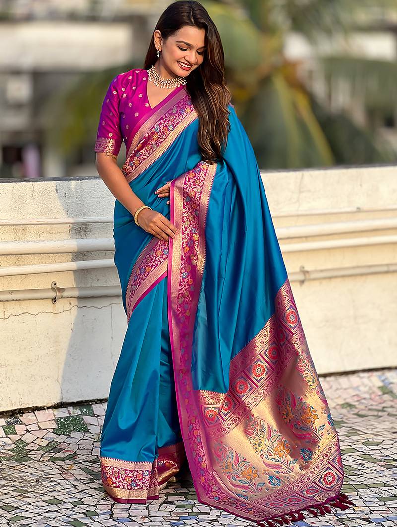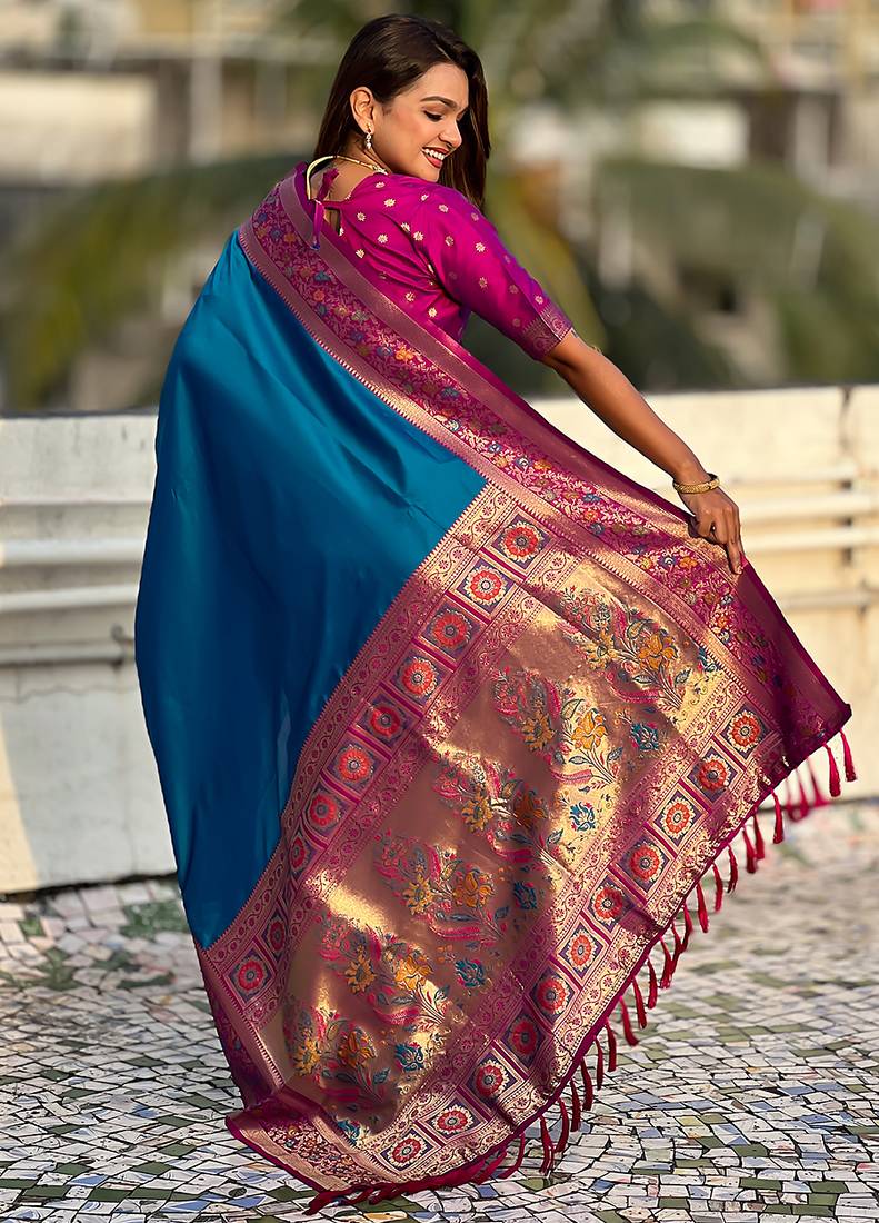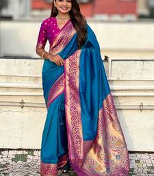 Blue woven self design pure silk paithani saree with blouse