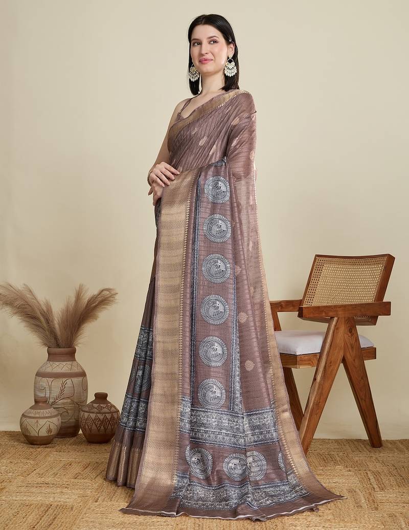 Brown printed floral print woven cotton silk kalamkari saree with blouse