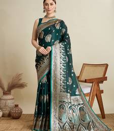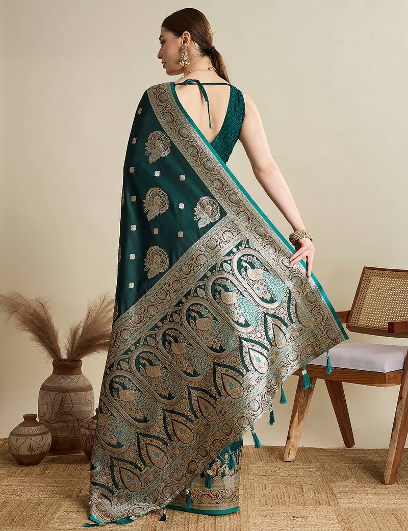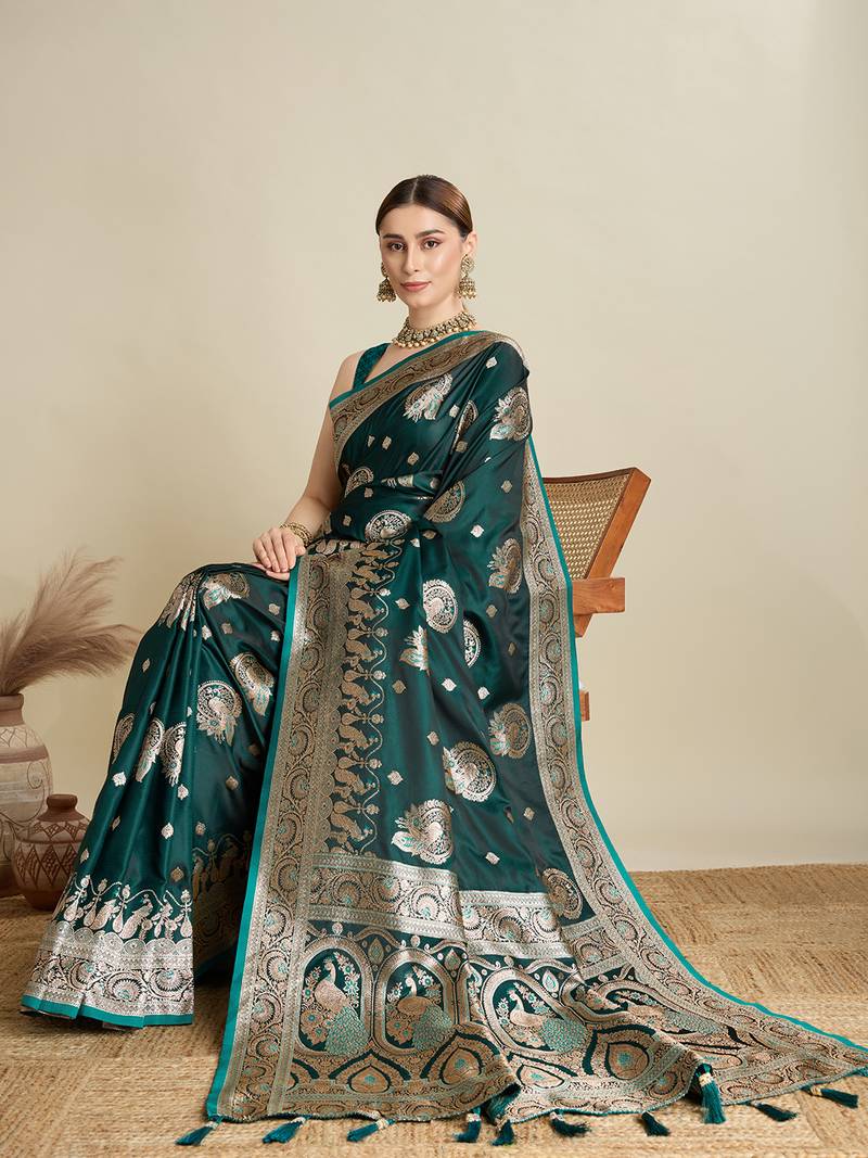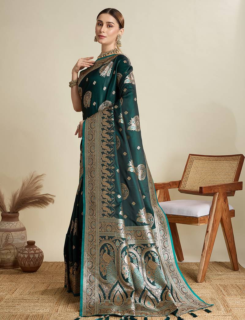Dark green woven embellished self design satin silk blend banarasi saree with blouse