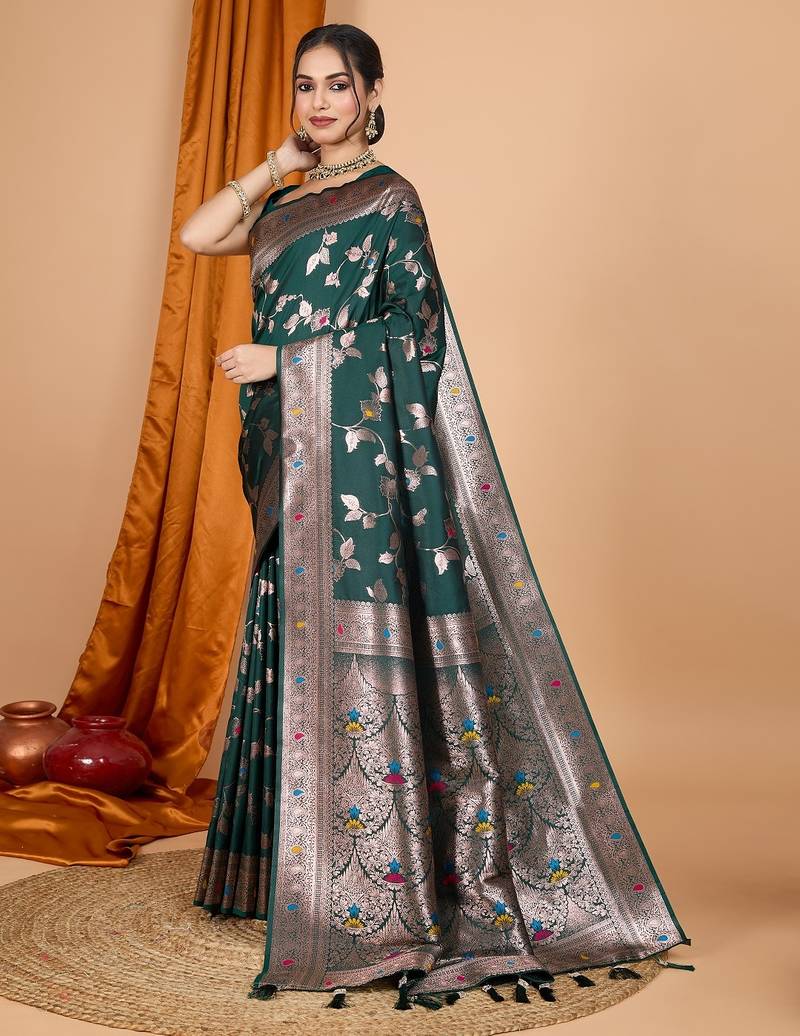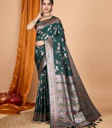 Dark green woven self design embellished pure silk banarasi saree with blouse
